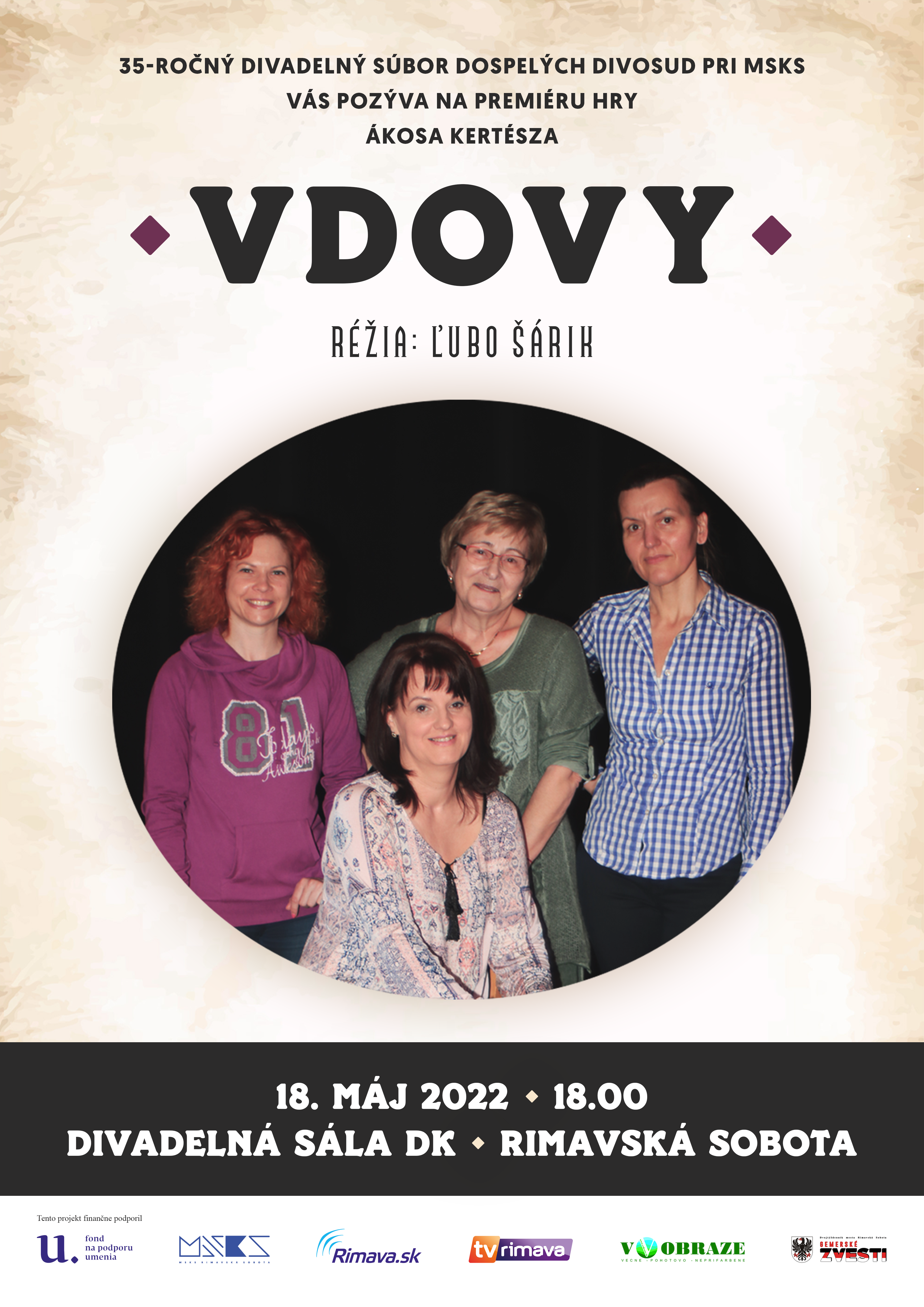 DS DIVOSUD pri MsKS a štyri skvelé herečky: Naďa Garajová, Hela Chrenková, Terka Maksi a Erika Gavurová Vás pozývajú v stredu, 18. 5. o 18.00 hod. do divadelnej sály DK na premiéru hry maďarského autora Ákosa Kertésza VDOVY. Hru pre potreby súboru upravil Ľubo Šárik. Inscenáciu z verejných zdrojov podporil Fond na podporu umenia.