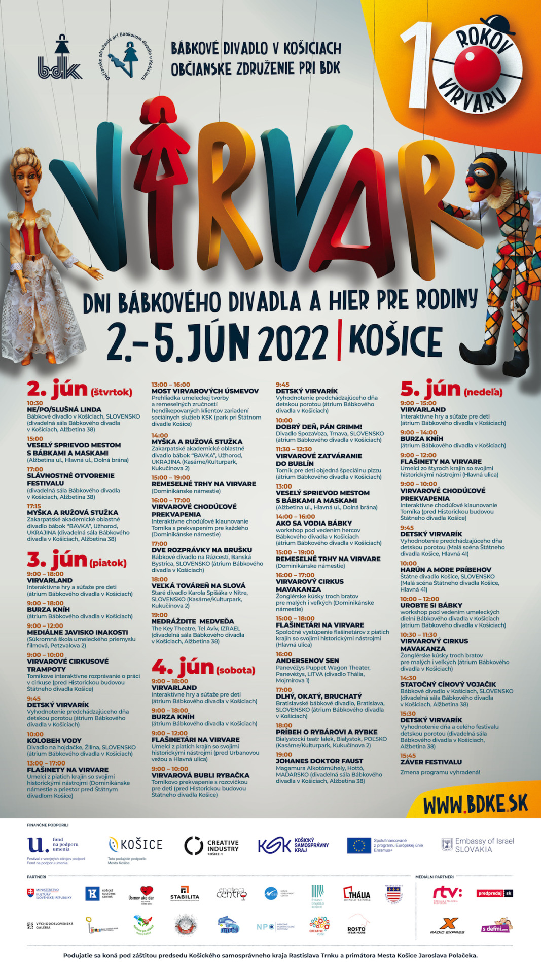 Prvý júnový týždeň už neodmysliteľne patrí festivalu Dni bábkového divadla a hier pre rodiny VIRVAR. Už po desiaty krát sa stretávajú v Košiciach tvoriví ľudia, tvorivé tímy s kreatívnymi nápadmi, ktoré majú umenie takpovediac v krvi a ktorí vždy potešia a rozveselia divákov a návštevníkov nášho festivalu a mesta Košice.