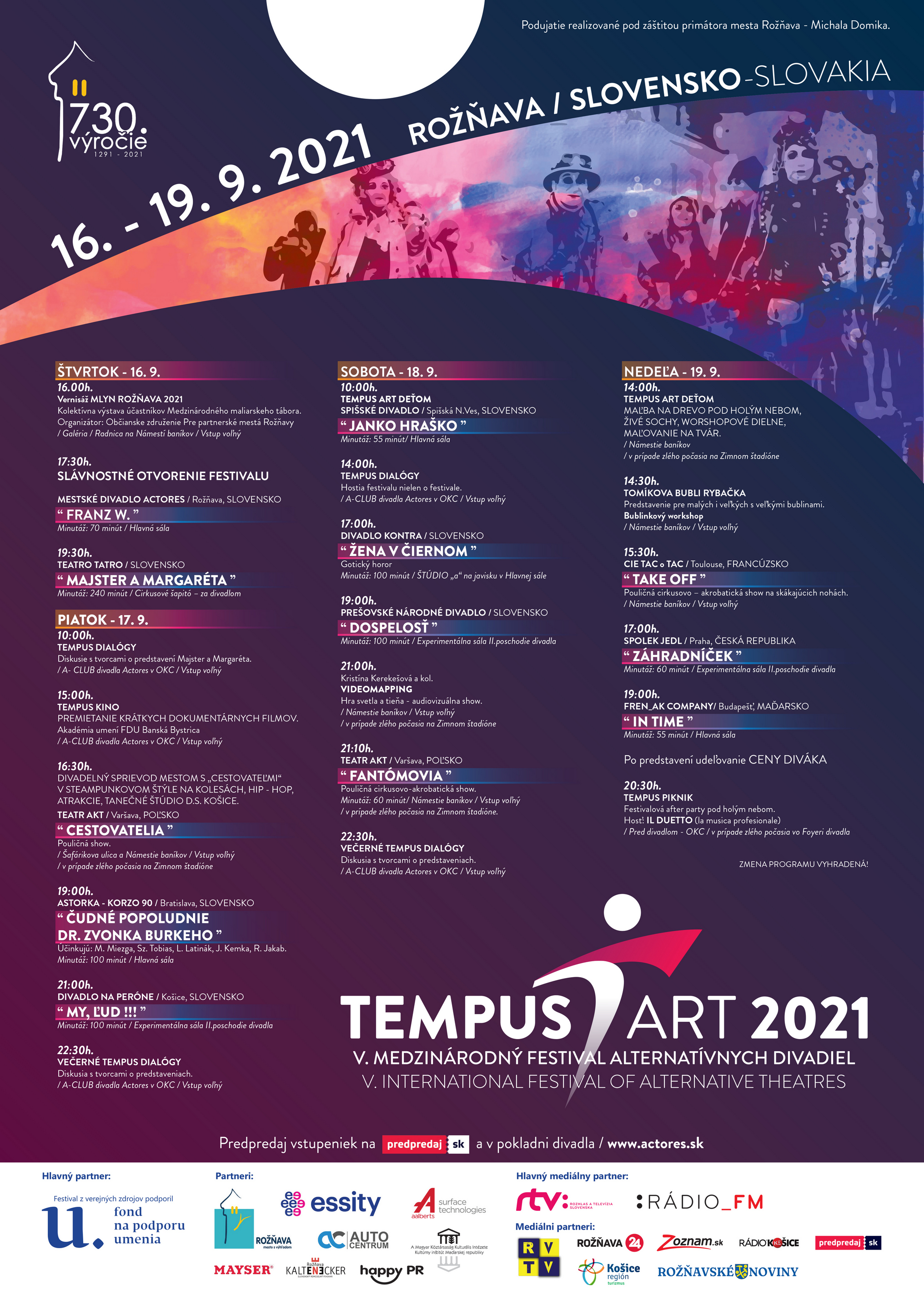 Divadlo ACTORES a Mesto Rožňava pozývajú na 5. ročník Medzinárodného festivalu alternatívnych divadiel TEMPUS ART, ktorý sa uskutoční v termíne 16. - 19. septembra 2021 v Rožňave. V tomto roku sa v programe predstaví 11 divadiel z Poľska, Českej republiky, Maďarska, Francúzska a Slovenska a budú sa uchádzať o Hlavnú cenu diváka. Festival prinesie off program, ktorý tvoria pouličné predstavenia, nočné stretnutia, rozhovory, cirkusové a akrobatické vystúpenia...