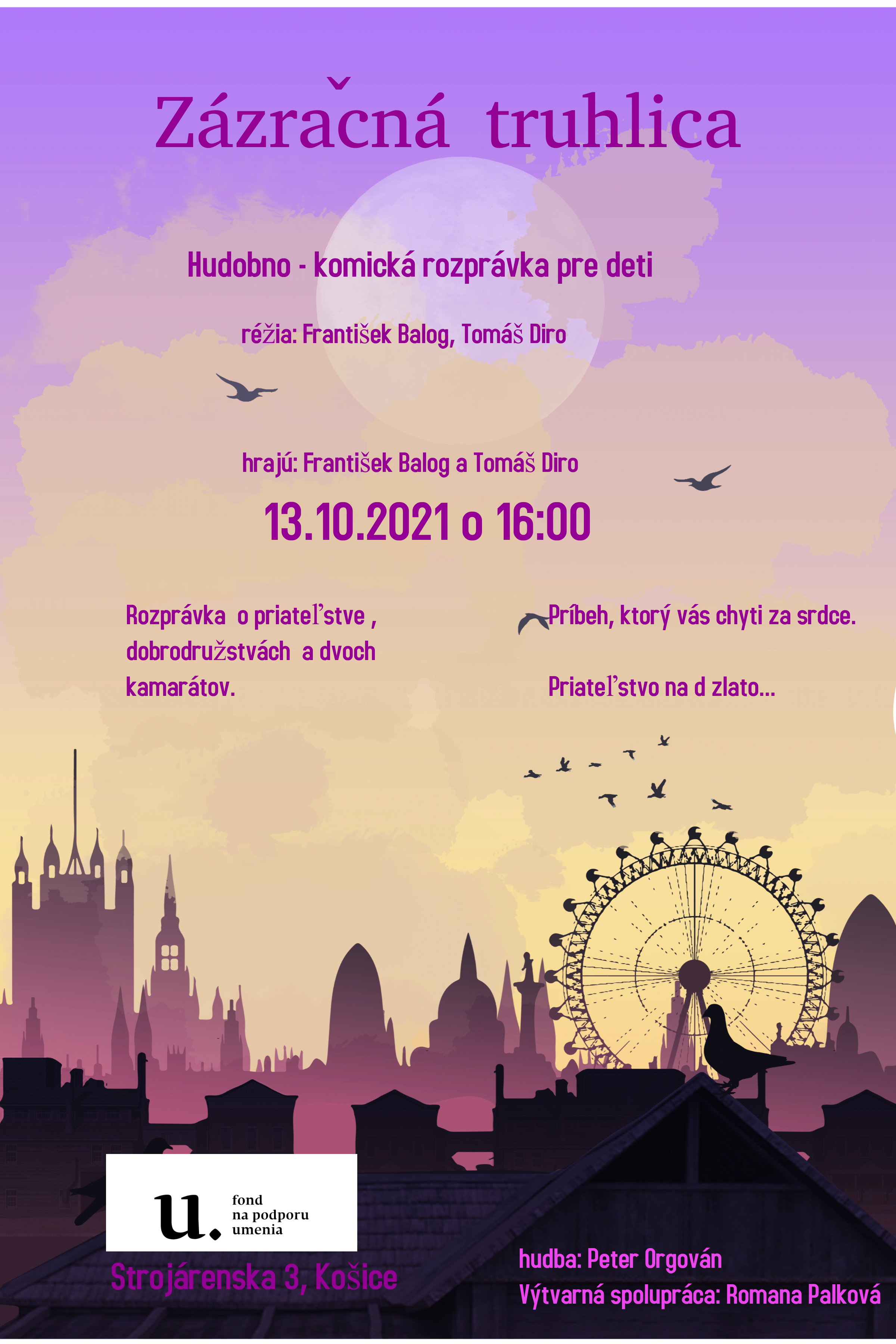 Rozprávková truhlica. Autorská hudobno cinoherná rozprávka o dvoch túlavých chlapcov , ktory si zijú strereotypným životom až kým honich nenaruší zázračná truhlica. Ta im ma ukázat ake dolezite je pristeľstvo a mat vytýčený životný ciel ktorý by im dával zmysel a zmenil ich život na o mnoho lepší. Šlo o interaktívne prevedenie a teda sme zapájali deti aby tak samy zistili aky je to pocit spolupatričnosti, pomoci jeden druhému a vnímanie rozdielu medzi dobrom o zlom.
