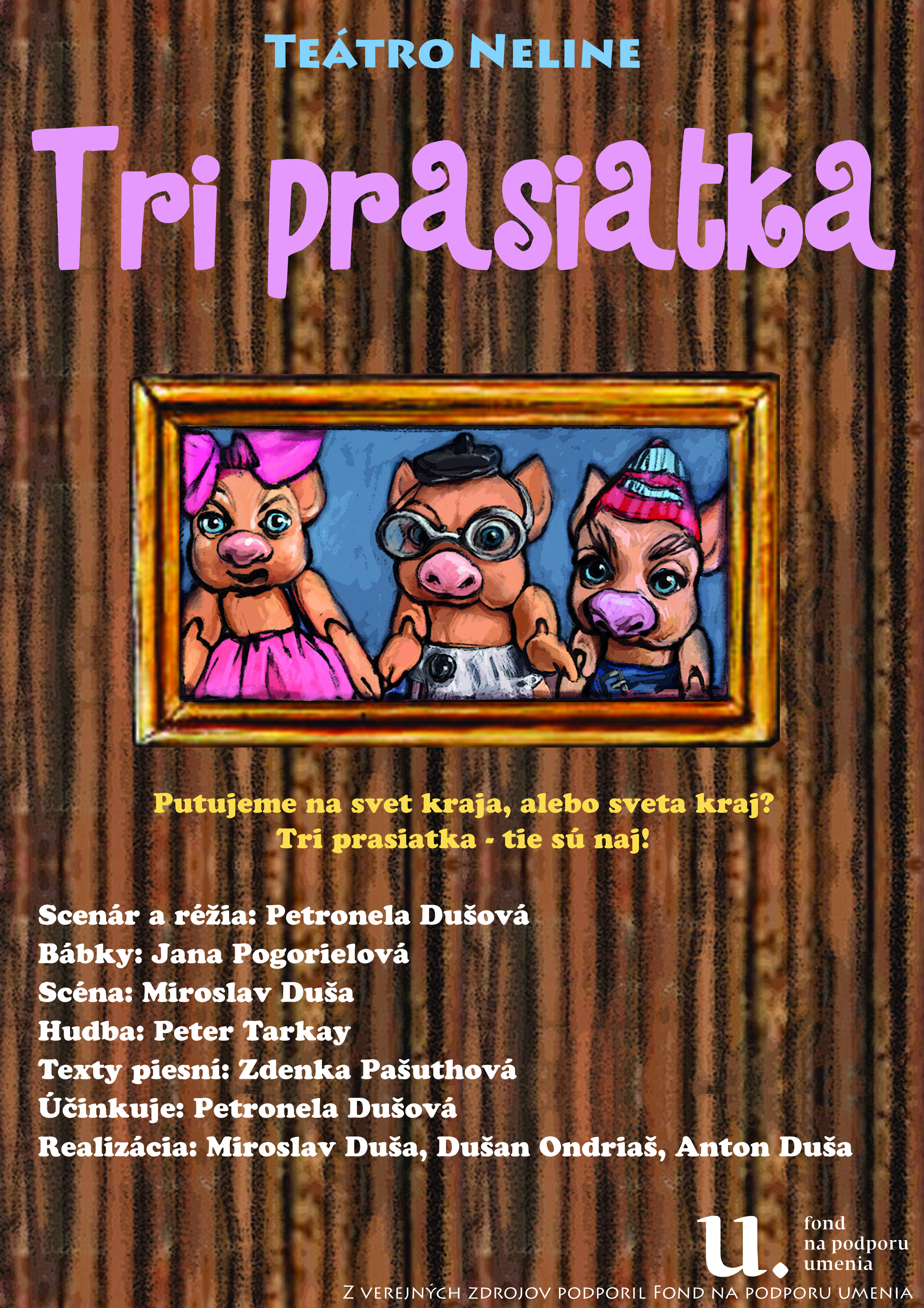 Hudobná bábková inscenácia Tri prasiatka je určená pre deti predškolského veku, ktorá sa hrá priamo v MŠ. Základnými umeleckými prvkami je: spojenie tradičných princípov a postupov bábkového divadla; vznik a interpretácia pôvodných autorských textov; interaktivita v predstavení. Interaktívnu inscenáciu pre deti predškolského veku interpretuje jedna bábkoherečka, ktorá hrá všetky postavy. Prinášame inscenáciu priamo do materských škôl v mestách, mestečkách, dedinách aj dedinkách.