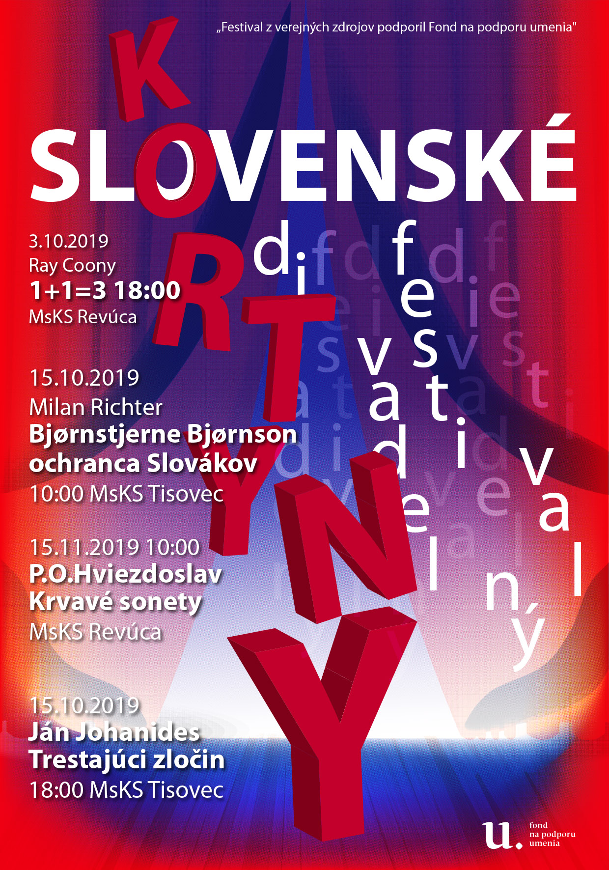 Zámerom prehliadky SLOVENSKE KORTYNY 2019 je sprístupniť profesionálne divadelné umenie v regióne Gemera. Tento ročník venujeme niekoľkým udalostiam - pripomínať - 100. výročiu tragickej smrti Milana Rastislava Štefánika a 100. výročiu vydania Hviezdoslavovho protestu proti vojne v 32 sonetoch. Výročia nám pripomínajú predovšetkým cenu slobody, či už národnej, politickej alebo osobnej a ustavičnú potrebu ju brániť a znovu ju potvrdzovať. Tejto myšlienke sme podriadili celý koncept festivalu.