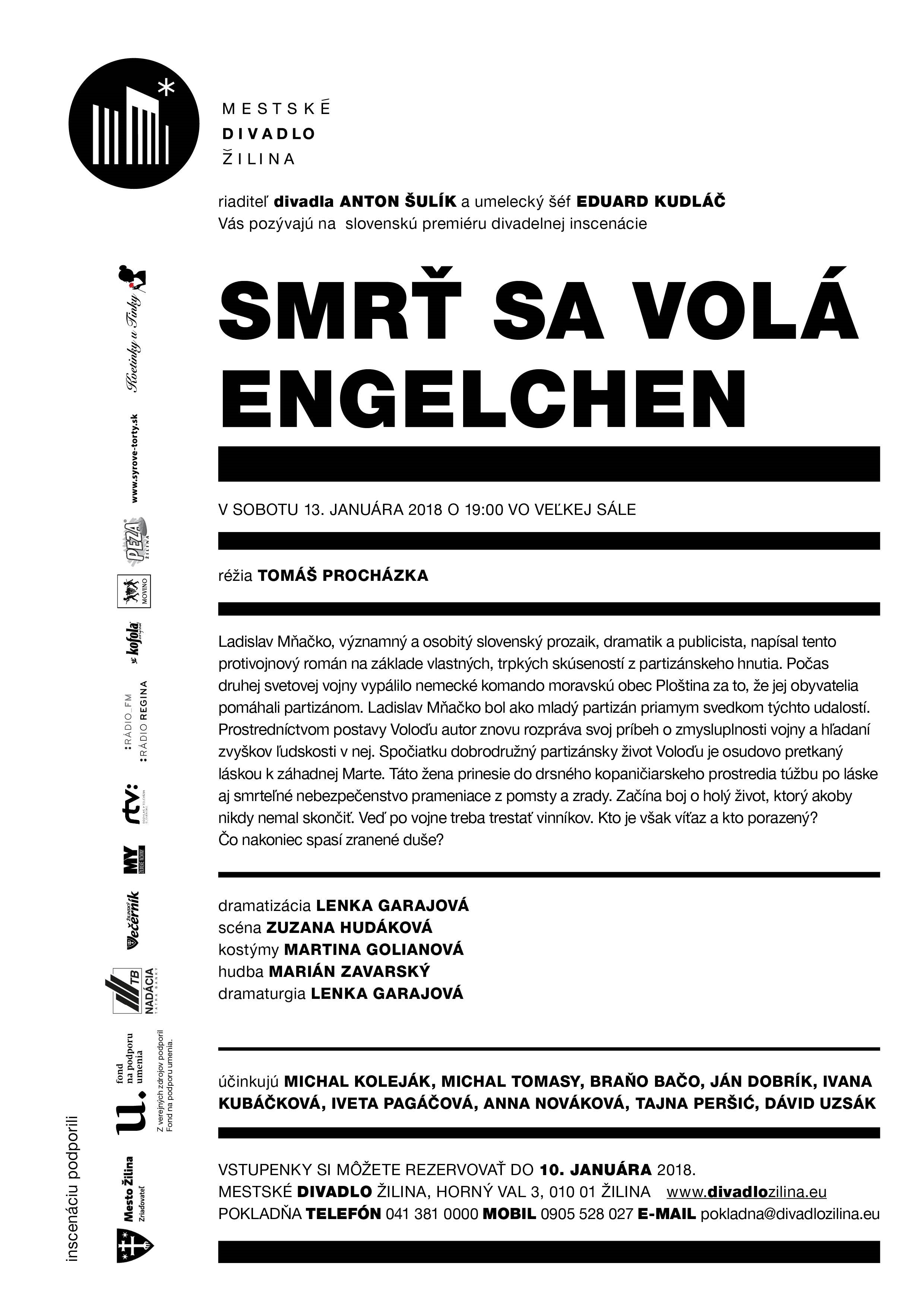 slovenská premiéra SMRŤ SA VOLÁ ENGELCHEN 13. január 2018 O 19:00, MESTSKÉ DIVADLO ŽILINA réžia TOMÁŠ PROCHÁZKA