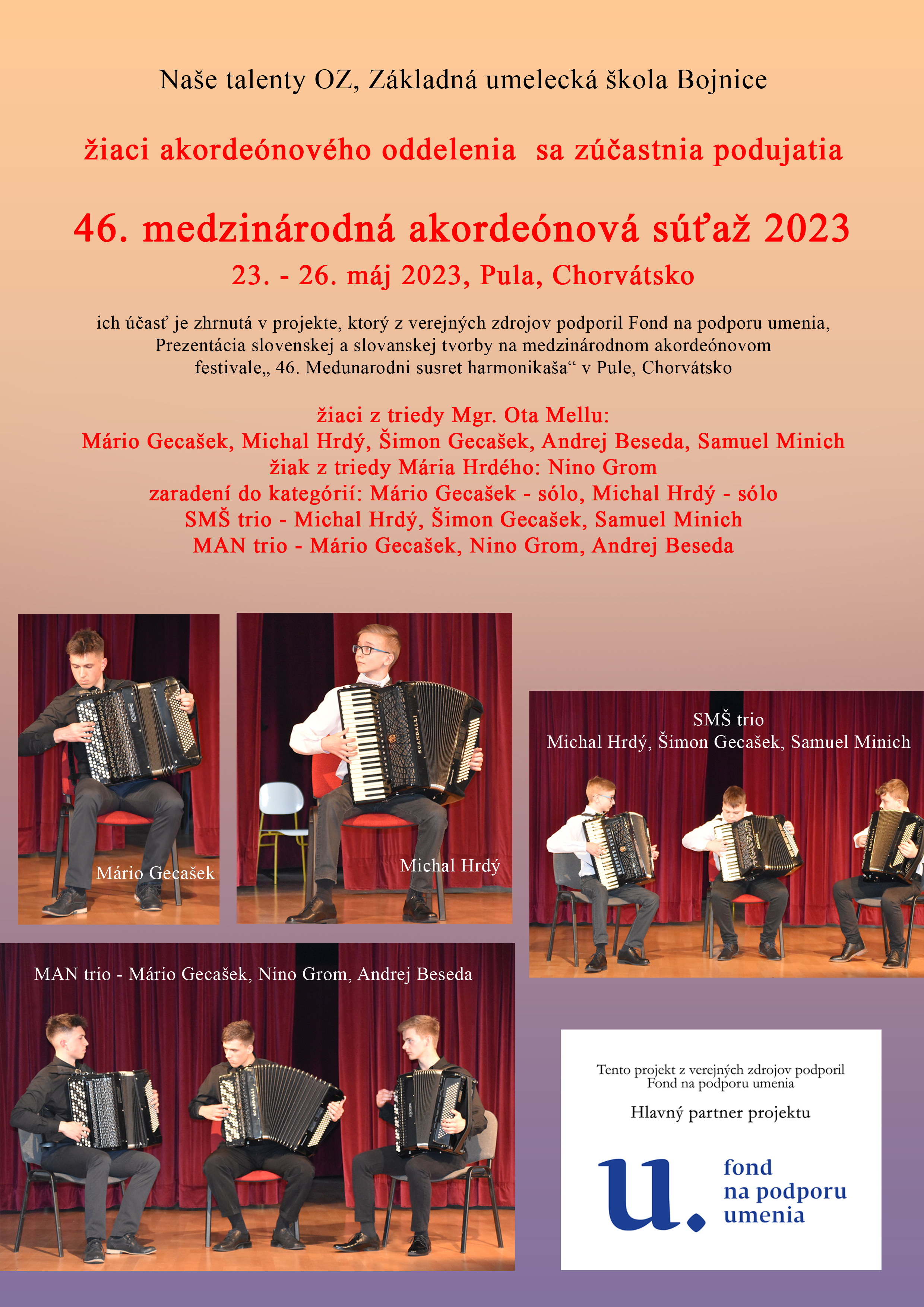 Prezentácia slovenskej a slovanskej tvorby na medzinárodnom akordeónovom festivale „46. Medunarodni susret harmonikaša“ v Pule (Chorvátsko). Zámerom projektu je podpora mladých talentovaných akordeonistov, študujúcich v ZUŠ Bojnice. Cieľom je umožniť im účasť na medzinárodnom akordeónovom festivale v Chorvátskej Pule a tým prezentovať originálnu tvorbu slovenských a slovanských hudobných skladateľov na medzinárodnej súťaži.