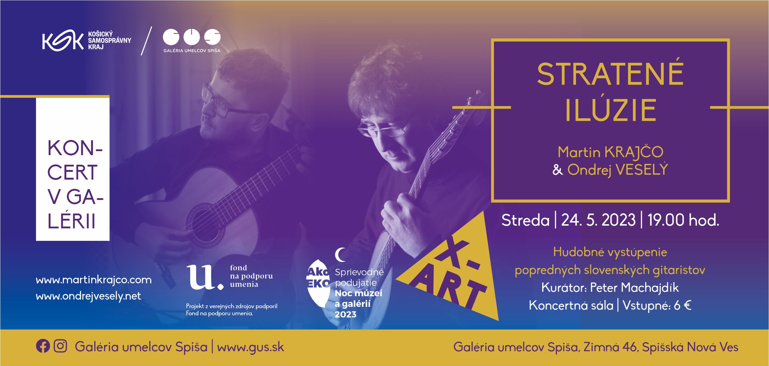 Hudobné vystúpenie popredných slovenských gitaristov Martina Krajča a Ondreja Veselého. Projekt z verejných zdrojov podporil Fond na podporu umenia. Vstupné: 6 €