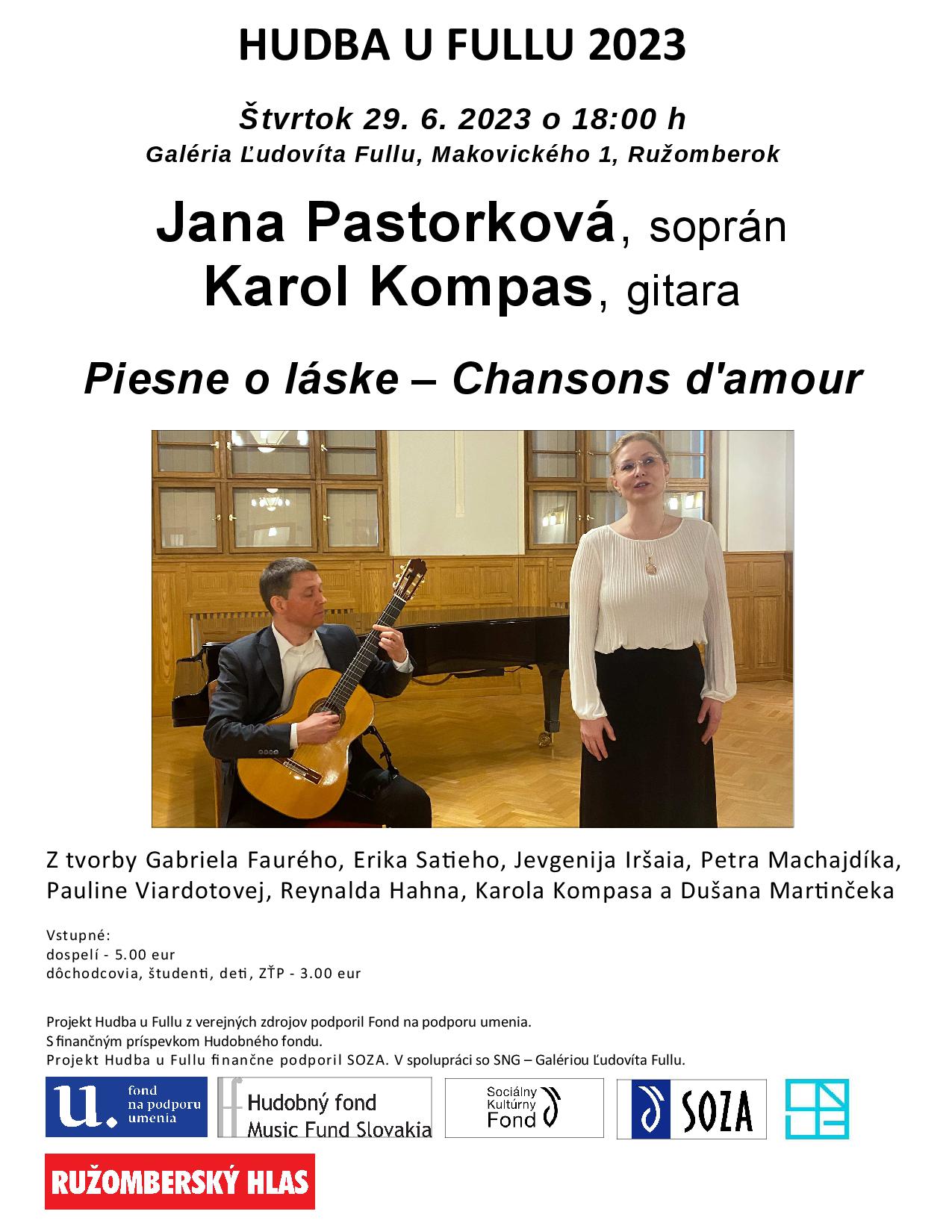 Cyklus komorných koncertov Hudba u Fullu bude pokračovať koncertom sopranistky Jany Pastorkovej a gitaristu Karola Kompasa. V ich interpretácii zaznejú diela Gabriela Faurého, Jevdenija Iršaia, Petra Machajdíka, Pauline Viardotovej, Erika Satieho, Reynalda Hahna a Dušana Martinčeka.