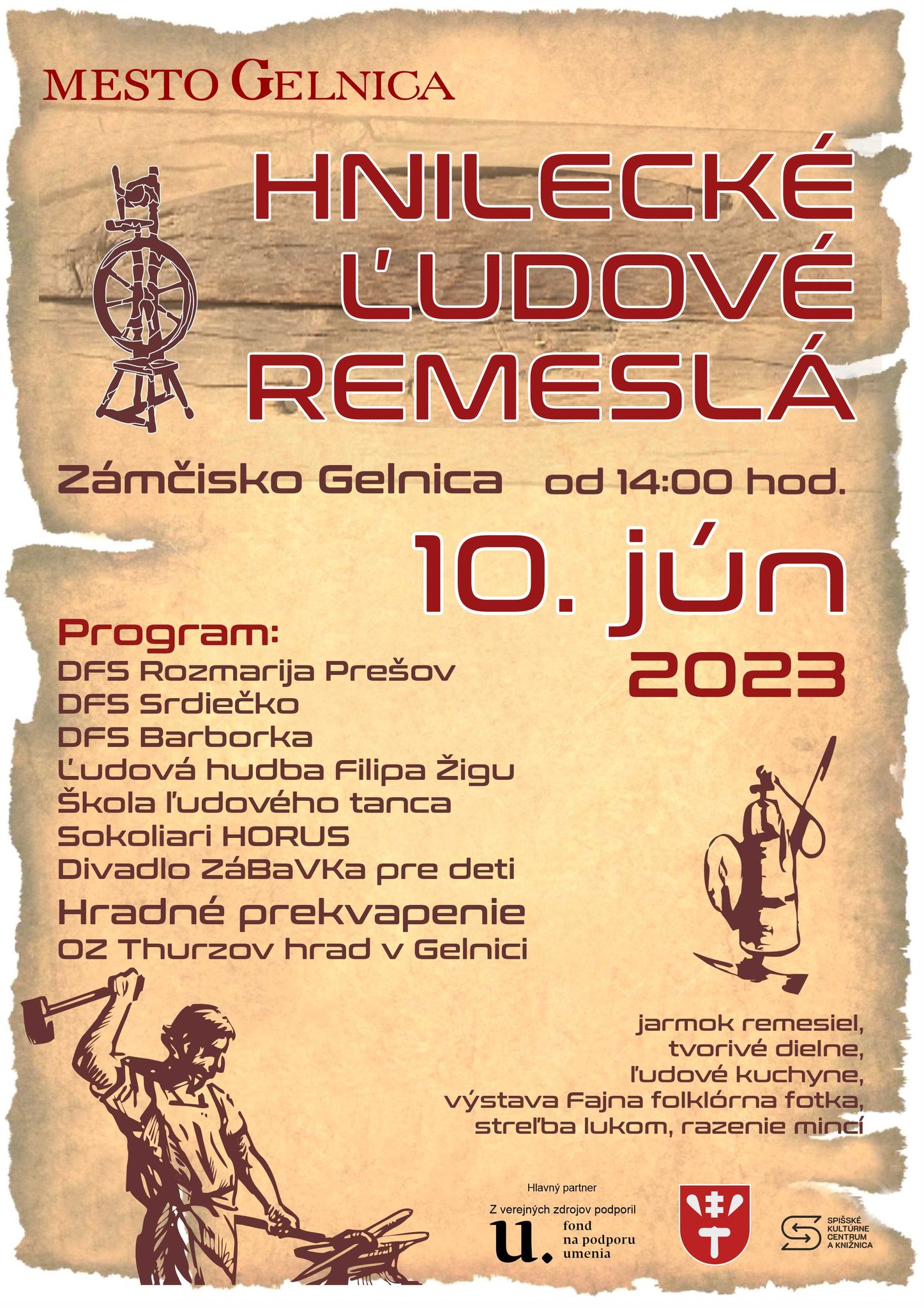 Mesto v spolupráci s FPU - pripravilo program - Hnilecké ľudové remeslá, ktorá sa uskutočnia - 10.6. 2023 na hradnom kopci Zámčisko. Podujatie začína - od 14.00 hod. kde sa predstavia -folklórne skupiny, ľudové hudba, škola ľudového tanca, sokoliari , divadlo, hradné prekvapenie, OZ Thurzov, remeselníci, tradičná kuchyňa, tvorivé dielne a množstvo ďalších aktivít pre rodiny s deťmi, pre širokú verejnosť.