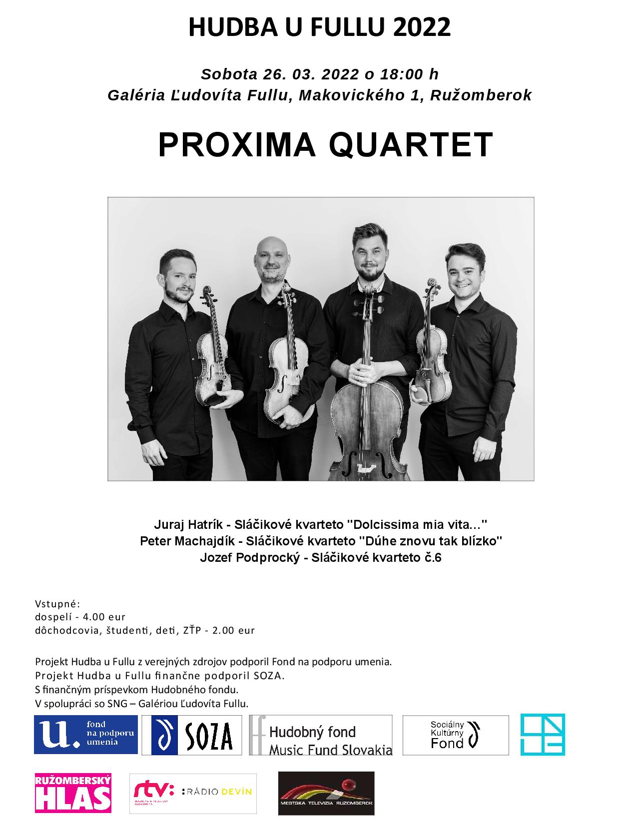 Koncert súboru PROXIMA QUARTET v rámci projektu Hudba u Fullu 2022 PROXIMA QUARTET: Adam Novák - prvé husle Patrik Klačanský - druhé husle Martin Mierny - viola Michal Haring - violončelo