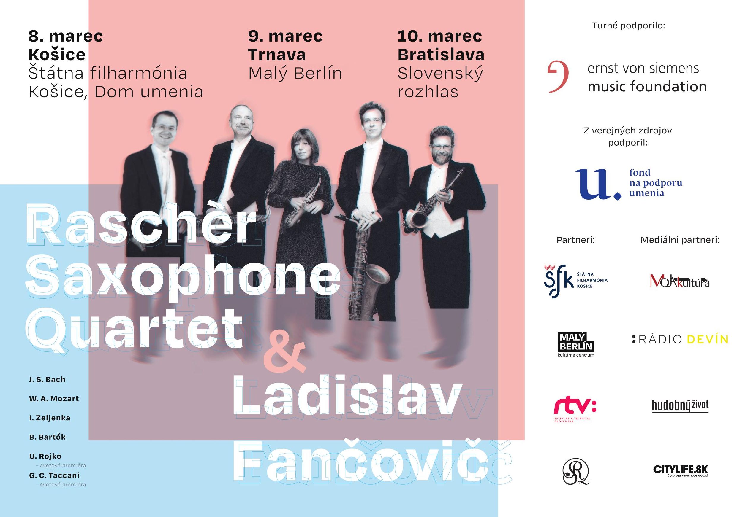 Turné nekorunovaných kráľov saxofónu s popredným slovenským klaviristom. Rascher Saxophone Quartet patrí už vyše 50 rokov k svetovej špičke interpretácie klasickej a súčasnej hudby na saxofónoch. Na ich historicky prvom koncertnom turné na Slovensku sa predstavia s programom aj v kombinácii s našim popredným umelcom Ladislavom Fančovičom, s ktorým odohrajú dve svetové premiéry.