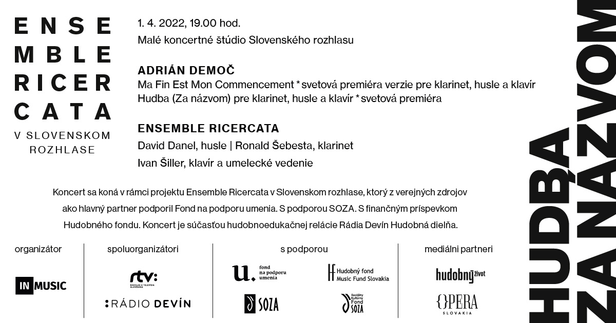 Slovenský súbor Ensemble Ricercata uvedie na svojom aprílovom koncerte (1.4. 2022 o 19.00) diela skladateľa Adriána Demoča, ktorého tvorba je uvádzaná najmä v zahraničí. Zaznejú dve diela- Ma fin est mon commencement (Môj koniec je mojím začiatkom) vo verzii pre klarinet, husle a klavír a v premiére odznie i Hudba (Za názvom) pre rovnaké obsadenie. Ensemble ricercata vystúpi v zložení Ivan Šiller, David Danel a Ronald Šebesta.