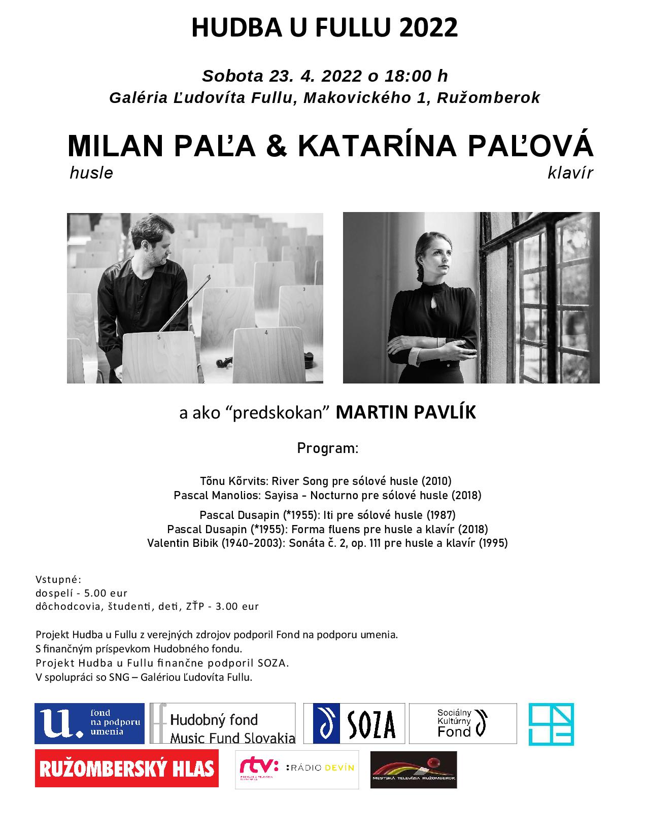 Cyklus komorných koncertov Hudba u Fullu bude pokračovať v sobotu 23. 4. 2022 o 18:00 h v Galérii Ľudovíta Fullu vystúpením huslistu Milana Paľu s manželkou Katarínou, ktorá ho bude sprevádzať na klavíri. Ako "predskokan" vystúpi študent Fakulty múzických umení Akadémie umení v Banskej Bystrici Martin Pavlík. Zaznejú diela súčasného francúzskeho skladateľa Pascala Dusapina a významného predstaviteľa ukrajinskej hudby, charkovského rodáka Valentina Bibika (*1940 - †2003).
