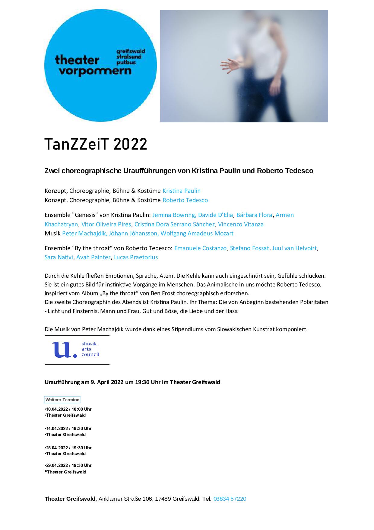 Premiéra tanečného projektu "Genesis" choreografky Kristíny Paulin s hudbou Petra Machajdíka. Projekt vznikol pre projekt TanZZeiT 2022 divadla Theater Vorpommern a bude v apríli a máji 2022 uvedený na javiskách divadiel v nemeckých mestách Greifswald a Stralsund.