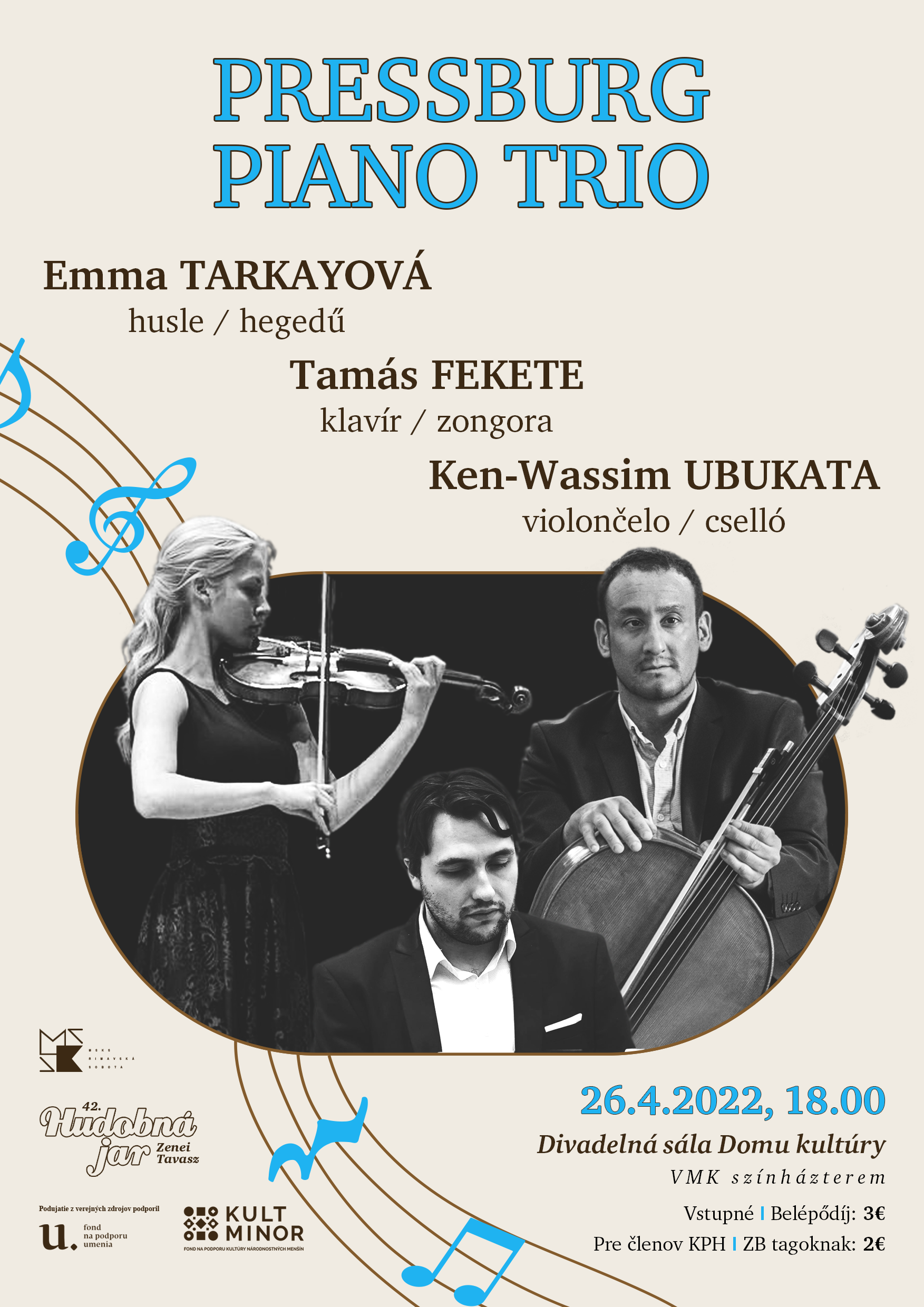 Cieľom projektu je udržať kontinuity koncertného života, prezentácia pôvodnej a svetovej hudobnej tvorby a umeleckých výsledkov dosiahnutých v oblasti profesionálneho hudobného umenia. Druhým koncertom Hudobnej jari bude koncert Pressburg piano trio. Účinkujú: Emma Tarkayová (husle), Tamás Fekete (klavír) a Ken-Wassim Ubukata (violončelo). Koncert sa uskutoční v sále DK 26.apríla 2022 o 18.00 hod.