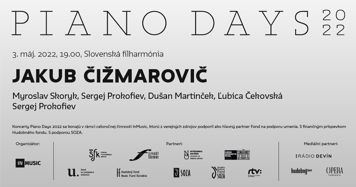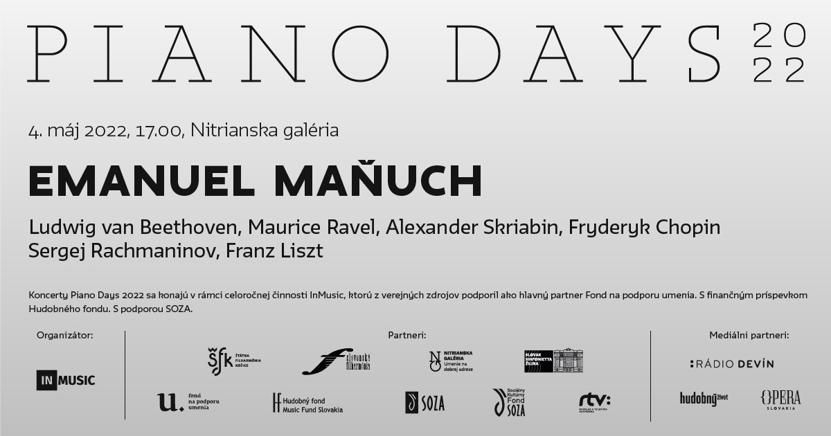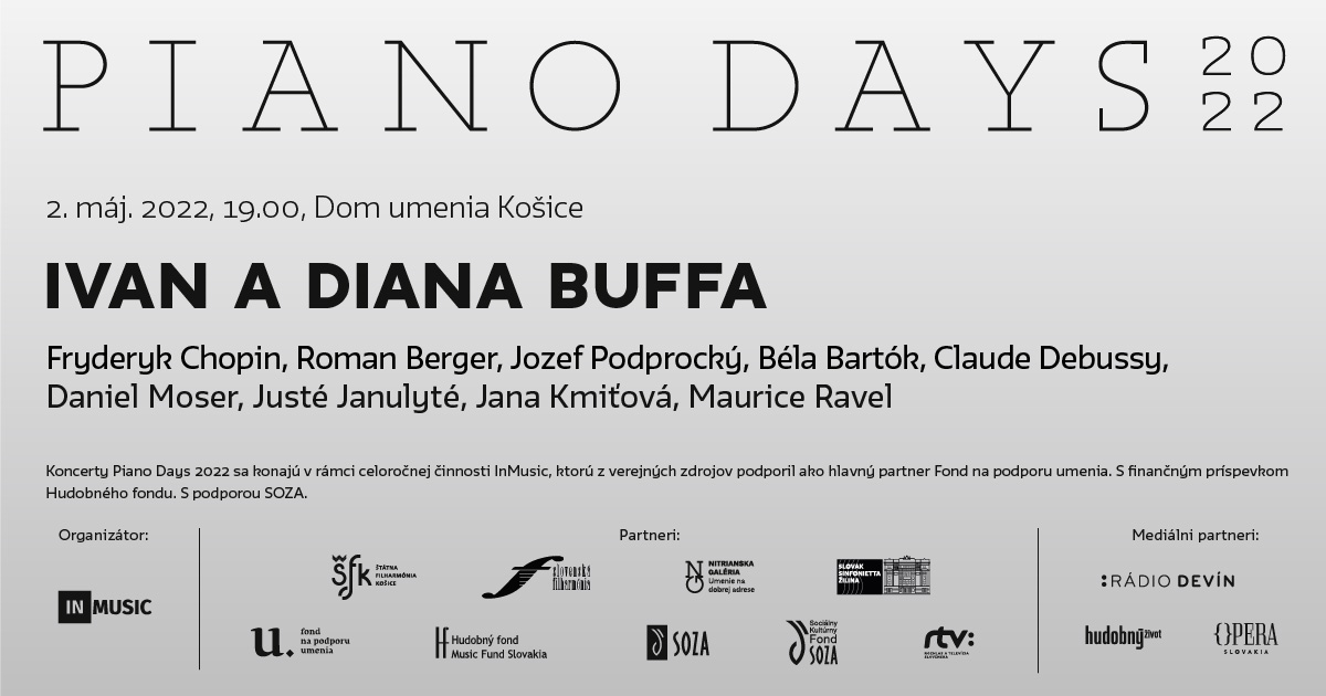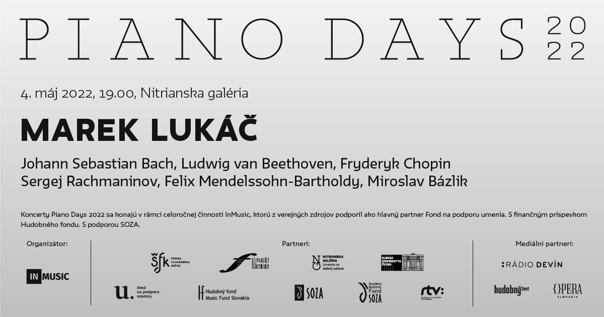Po úspešnom pilotnom online ročníku festivalu Piano Days občianske združenie InMusic zopakuje maratón sólových klavírnych recitálov aj v roku 2022. Ideou festivalu je prepojiť mestá po celom Slovensku individuálnymi koncertmi etablovaných i mladých klaviristov, odchovancov slovenskej klavírnej pedagogiky. Celkovo sa počas jedného týždňa medzi 2. – 8. májom 2022 uskutoční osem koncertov: