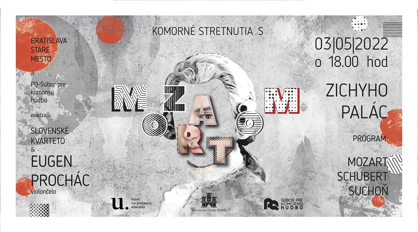 Slovenské kvarteto a Eugen Prochác - violončelo 3.5.2022 o 18:00 hod., Zichyho palác Bratislava. Pavol Varga, Eduard Pingitzer, Peter Zwiebel, Martin Ťažký s hosťom Eugenom Prochácom uvedú diela od W. A. Mozarta, E. Suchoňa a F. Schuberta