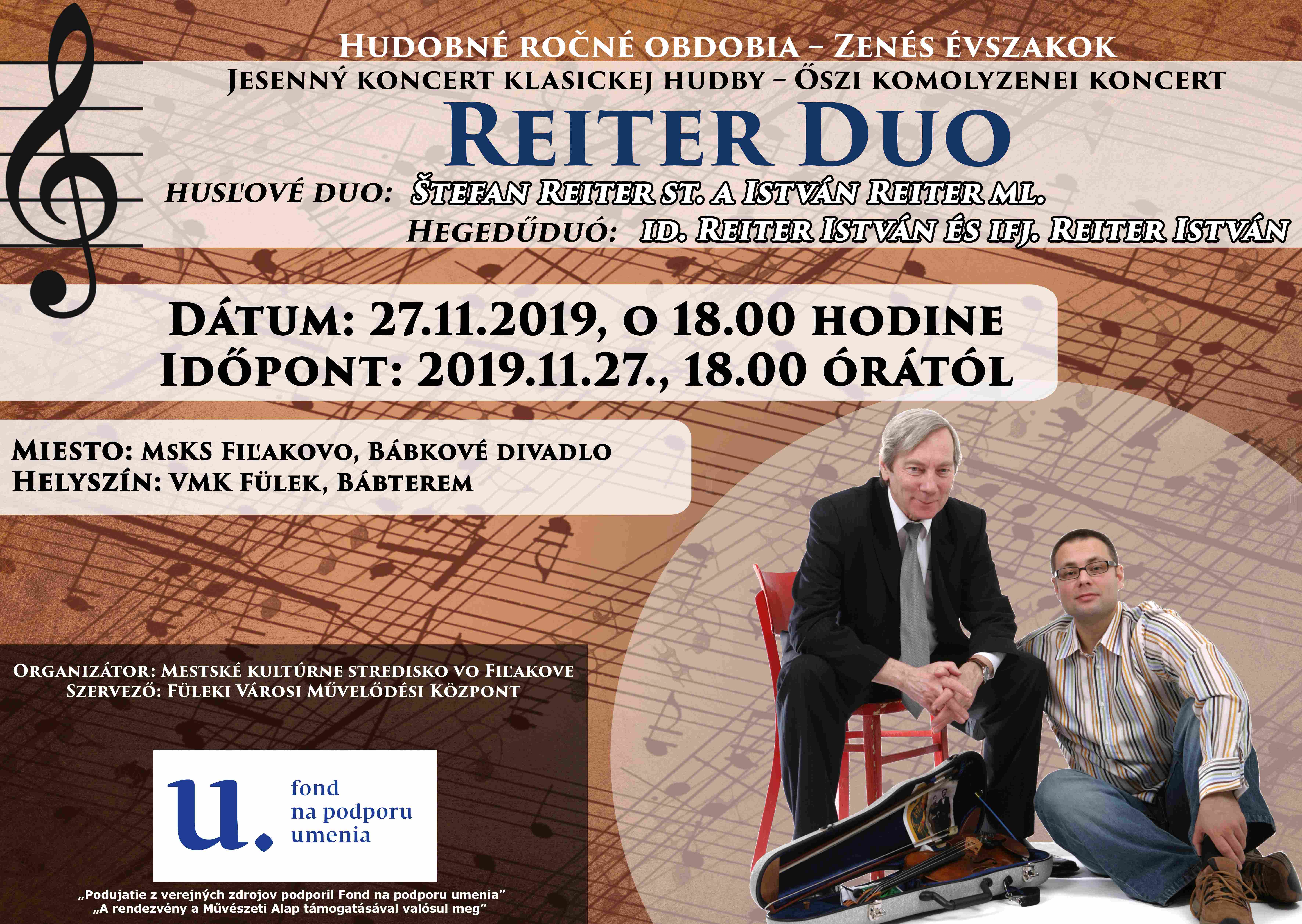 Jesenný koncert klasickej hudby husľového dua Reiter duo, ktoré ukončí sériu koncertov klasickej hudby pod názvom Hudobné ročné obdobia. Koncert sa uskutoční 27. novembra 2019 v budove Mestského kultúrneho strediska vo Fiľakove so začiatkom o 18:00 hod.