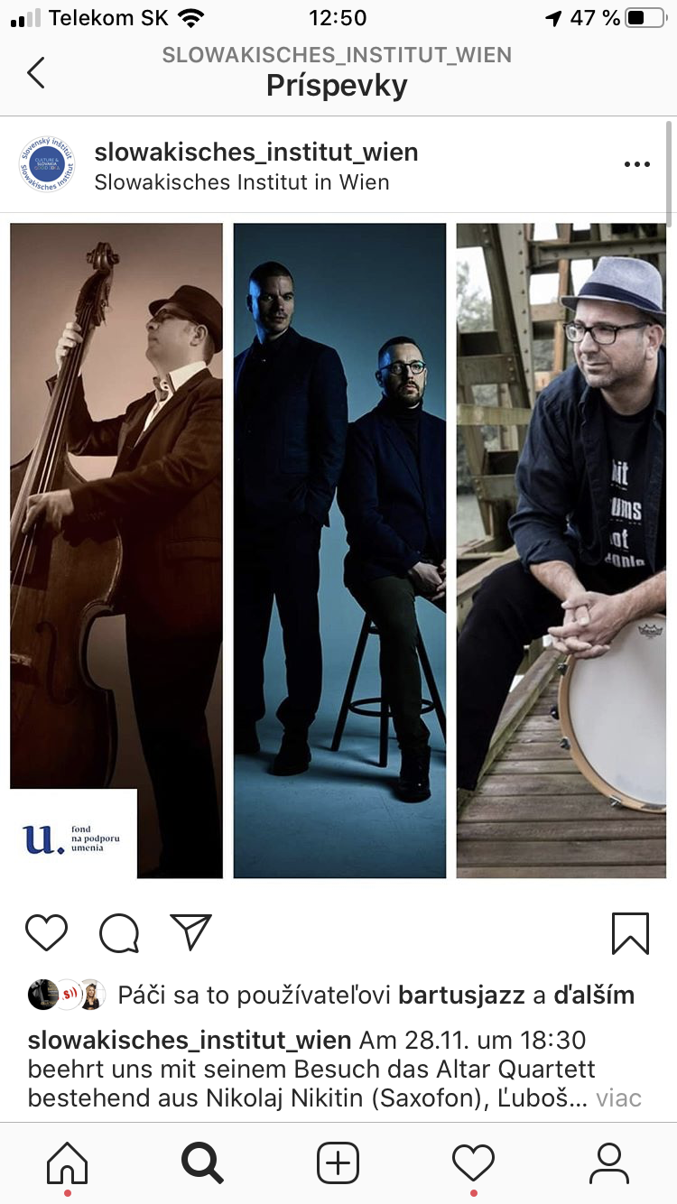 koncert na Slovesnkom inštitúte vo Viedni. Obsadenie: Nikolaj Nikitin saxofón, Ľuboš Šrámek klavír, Štefan Bartuš kontrabas a Klemens Marktl bicie nástroje.