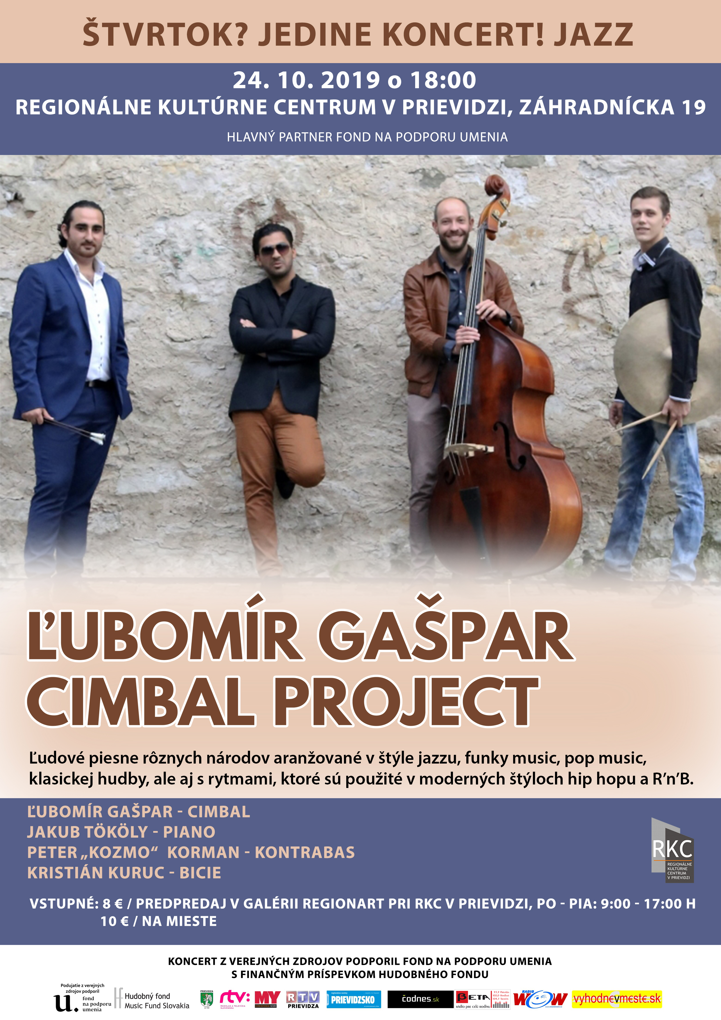 Koncert hudobnej formácie Ľubomír Gašpar Cimbal Project sa uskutoční v rámci koncertného cyklu "Štvrtok? Jedine koncert!" dňa 24. októbra 2019 o 18:00 h v Regionálnom kultúrnom centre v Prievidzi.