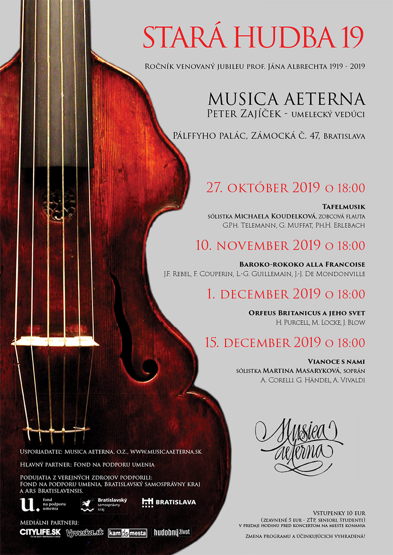 Jesenný cyklus 4 koncertov komornej hudby súboru starej hudby Musica aeterna pod umeleckým vedením Petera Zajíčka s odborným výkladom, približujúcim historické a hudobné kontexty dramaturgických akcentov toho ktorého koncertu. V prestávke je stretnutie s umelcami pri čaši vína a napečených dobrotách.