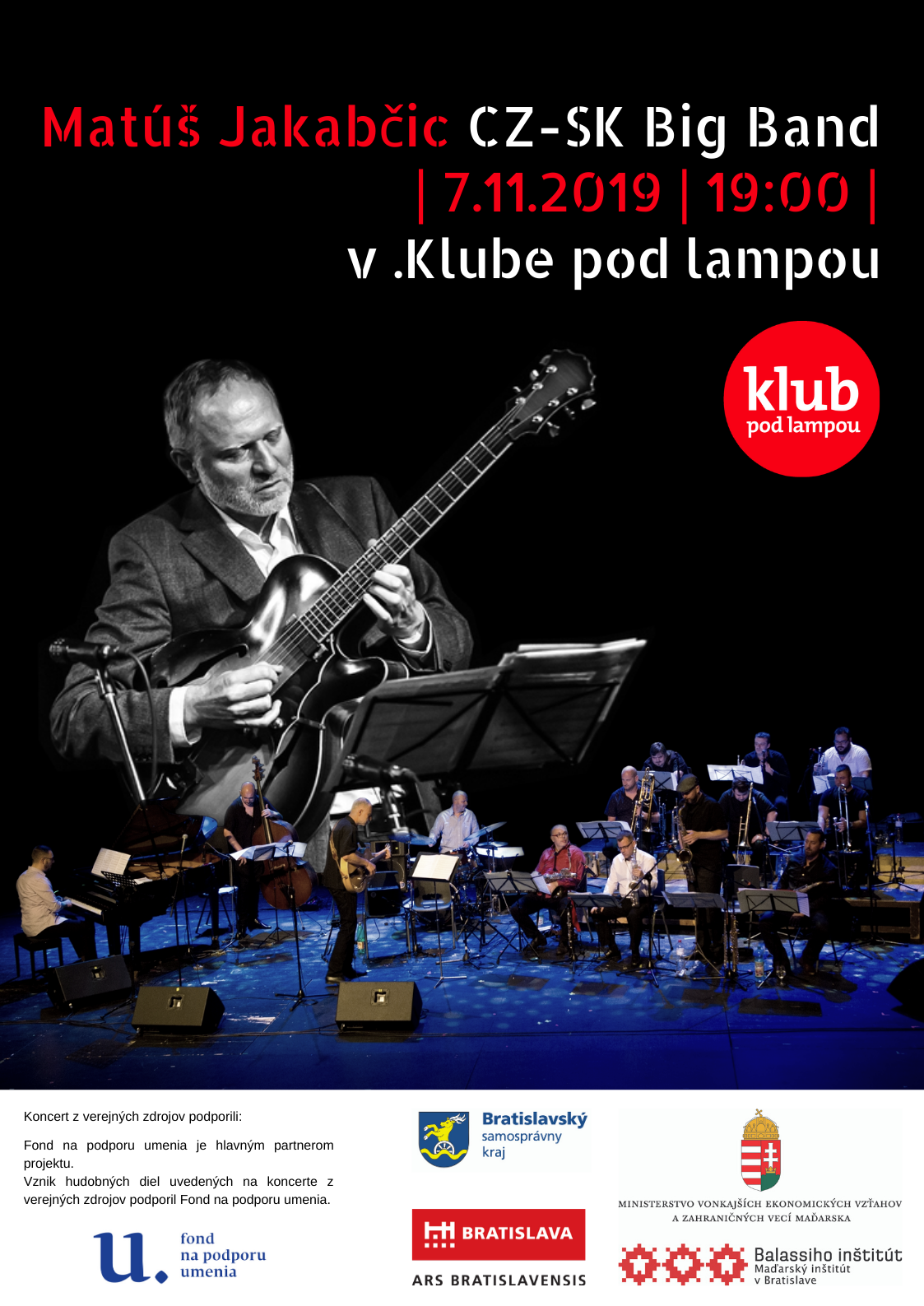 Koncert Matúš Jakabčic CZ-SK Big Band na ktorom zaznejú diela, ktoré vznikli s podporou FPU. .klub pod lampou, 07.11.2019 o 19 00 hod.