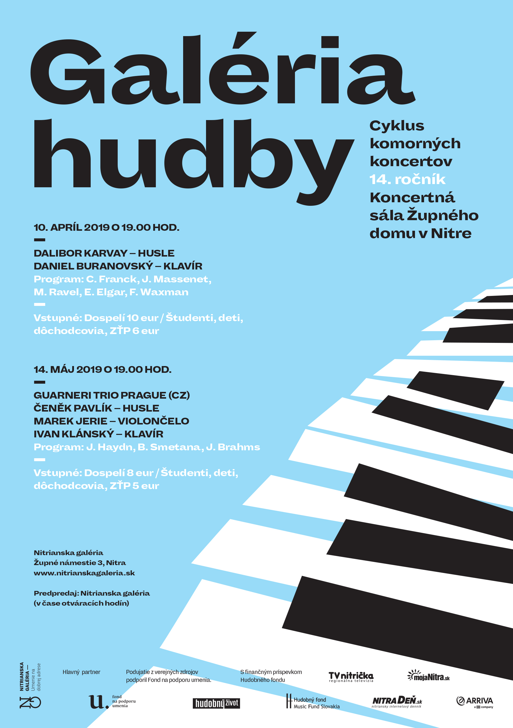 Galéria hudby je cyklus komorných koncertov zameraných na hlbšie spoznávanie vážnej hudby všetkých historických období a súčasnej hudby. V roku 2019 chceme progresívnou dramaturgiou prezentovať významné diela zo sólovej i komornej hudby rôznych historických období. Diela svetových i domácich skladateľov zaznejú v interpretácií úspešných hudobníkov, ktorí sa etablovali nielen na domácej, ale aj na medzinárodnej scéne.