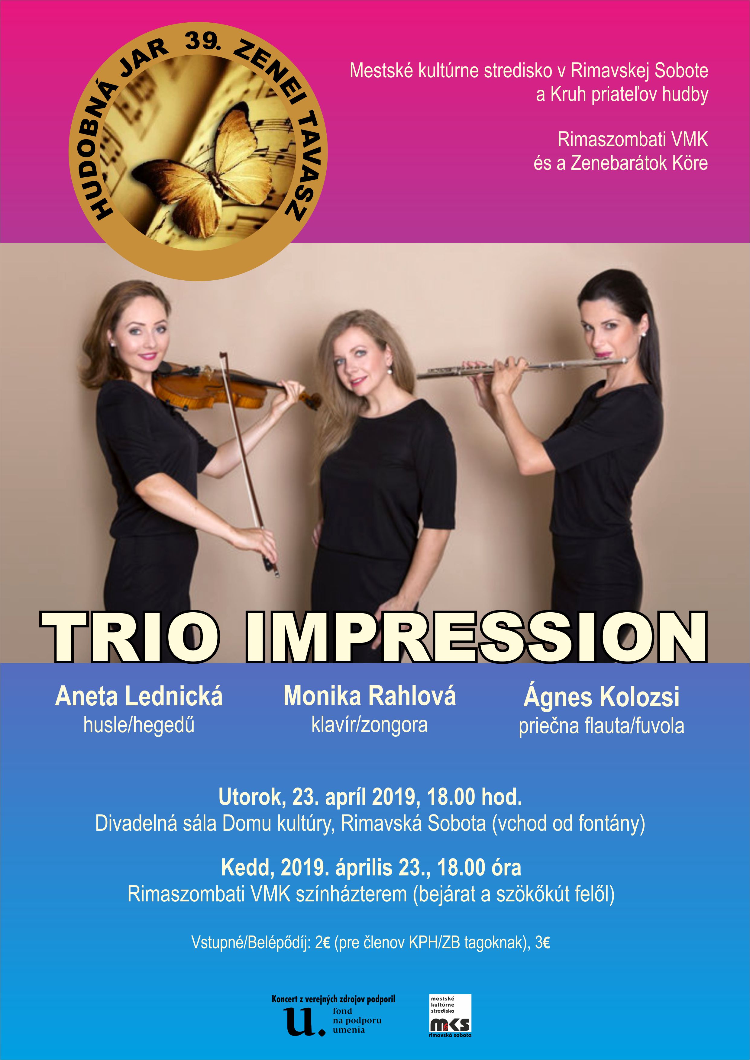 Trio Impression (Aneta Lednická-husle, Ágnes Kolozsi-priečna flauta, Monika Rahlová-klavír) sú absolventky VŠMU v Bratislave. Pôsobia ako Trio už od roku 2011 a tešia sa množstvu vystúpení. V repertoári majú široký výber diel z obdobia baroka, klasicizmu ale aj hudby 20. storočia, pričom s obľubou prezentujú diela aj slovenských autorov. V Rimavskej Sobote 23. apríla zaznejú v ich podaní diela F.Kuhlaua, F.Farkasa, V.Montiho, F.Liszta, I.Zeljenku, J.Brahmsa, E.Morriconeho a C.Gardela.