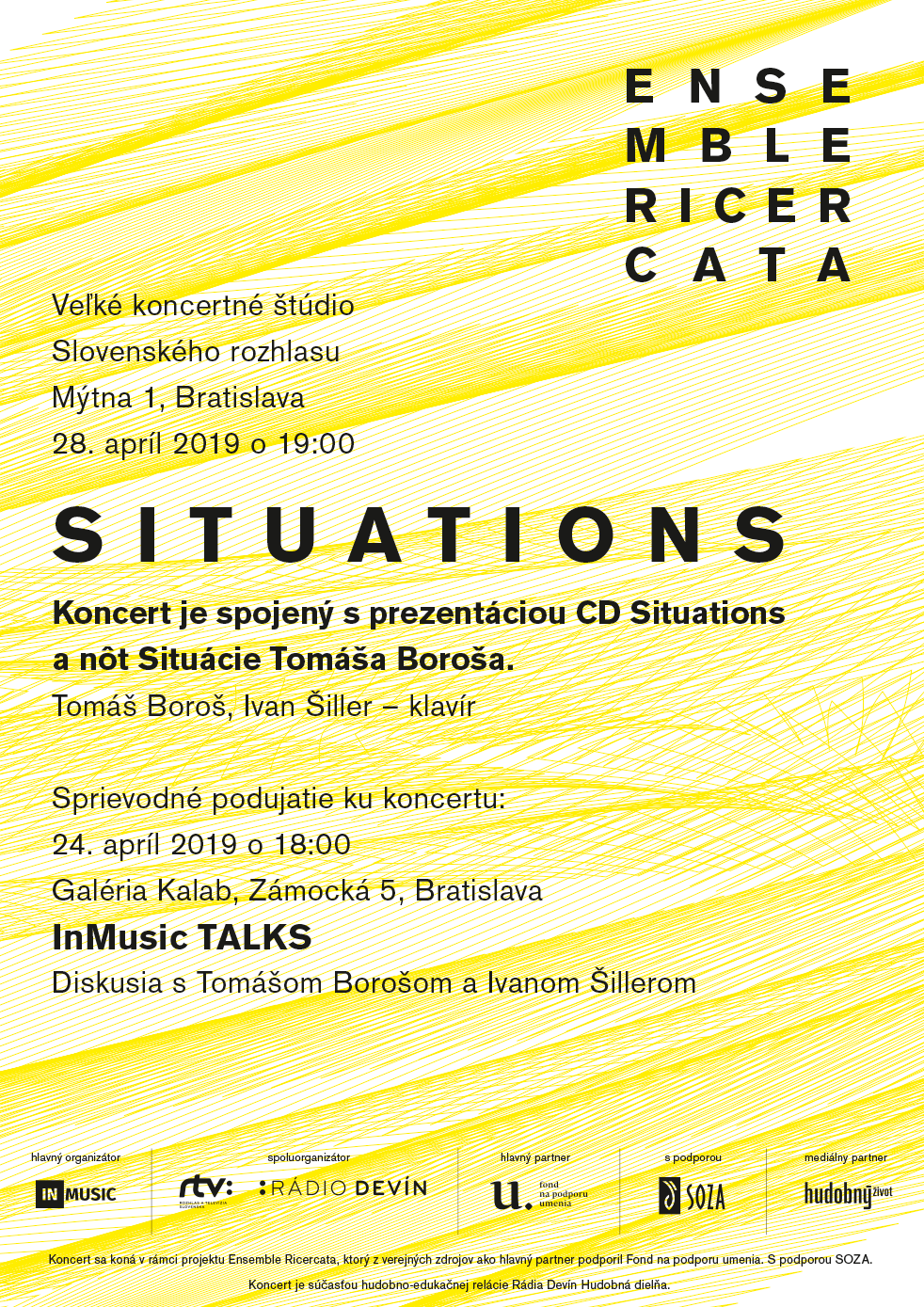 Hosťami diskusie budú Ivan Šiller a Tomáš Boroš. Moderuje Zuzana Jasenková. Diskusia sa koná ako sprievodné podujatie koncertu Ensemble Ricercata - Situations.