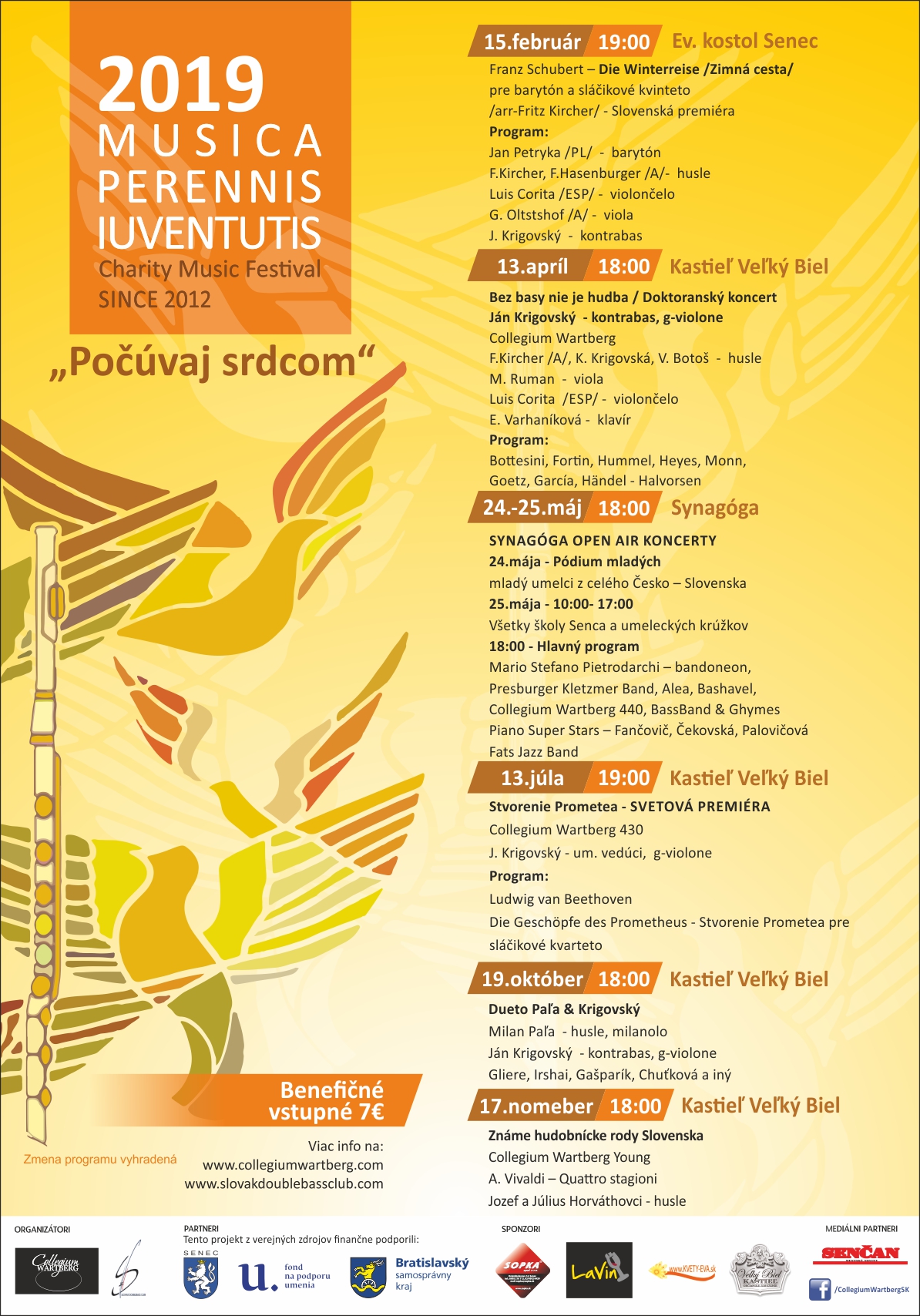 Musica Perennis Iuventutis 2019 je celoročný hudobno benefičný festival na podporu postihnutých detí a rodín z deťmi v hmotnej núdzi. Jeho 8.ročník ponúka v Seneckom okrese a jeho blízkom okolí ponúka vysoko kvalitné hudobné umenie rôznorodých hudobných žánrov a interpretov Slovenska a Európy.