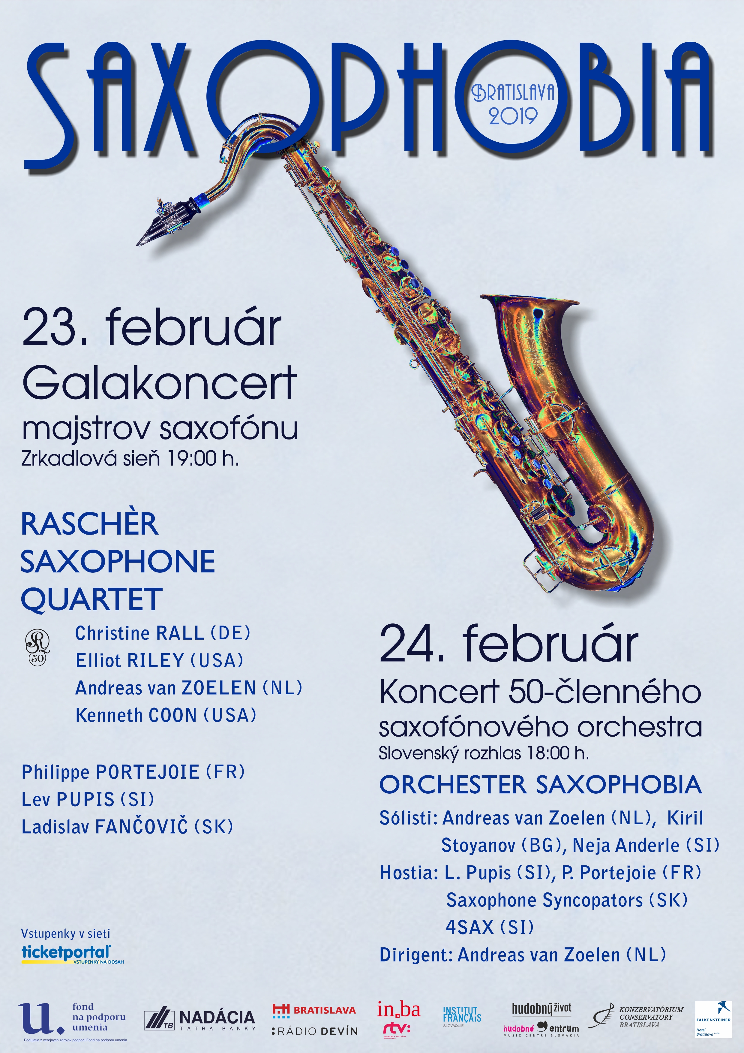 Orchester bude zložený z vyše 50-tich účastníkov medzinárodných saxofónových majstrovských kurzov Saxophobia Bratislava 2019 a predstavia sa v ňom skoro všetky druhy saxofónov od sopraninového cez sopránový, altový, tenorový, barytónový až po basový saxofón. Koncert sa uskutoční vo Veľkom koncertnom štúdiu Slovenského rozhlasu, začiatok o 18:00.