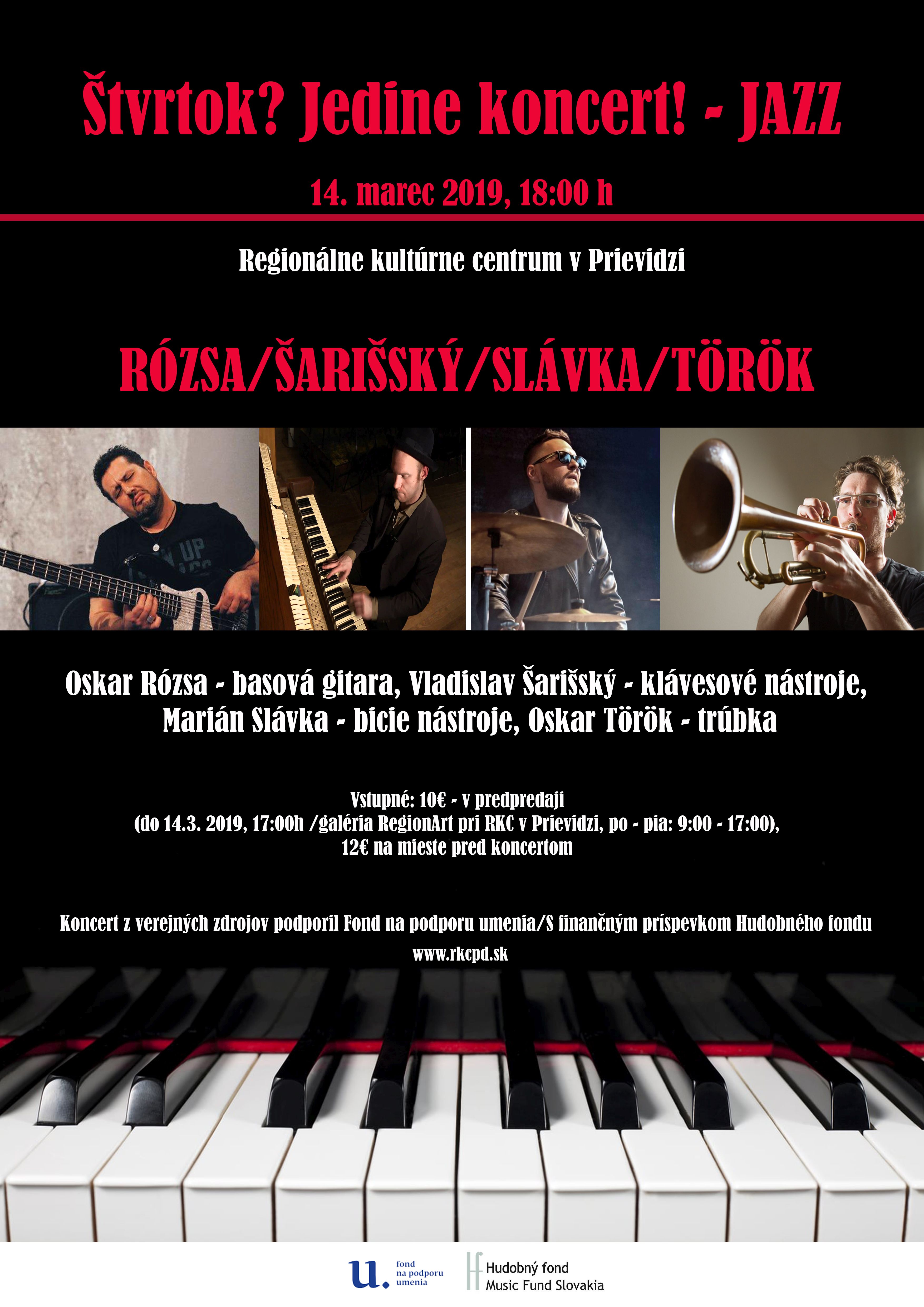Koncert štyroch špičkových džezových hudobníkov - Oskara Rózsu, Oskara Töröka, Vladislava šarišského a Mariána Slávku v rámci koncertného cyklu "Štvrtok? Jedine koncert! v Regionálnom kultúrnom centre v Prievidzi.