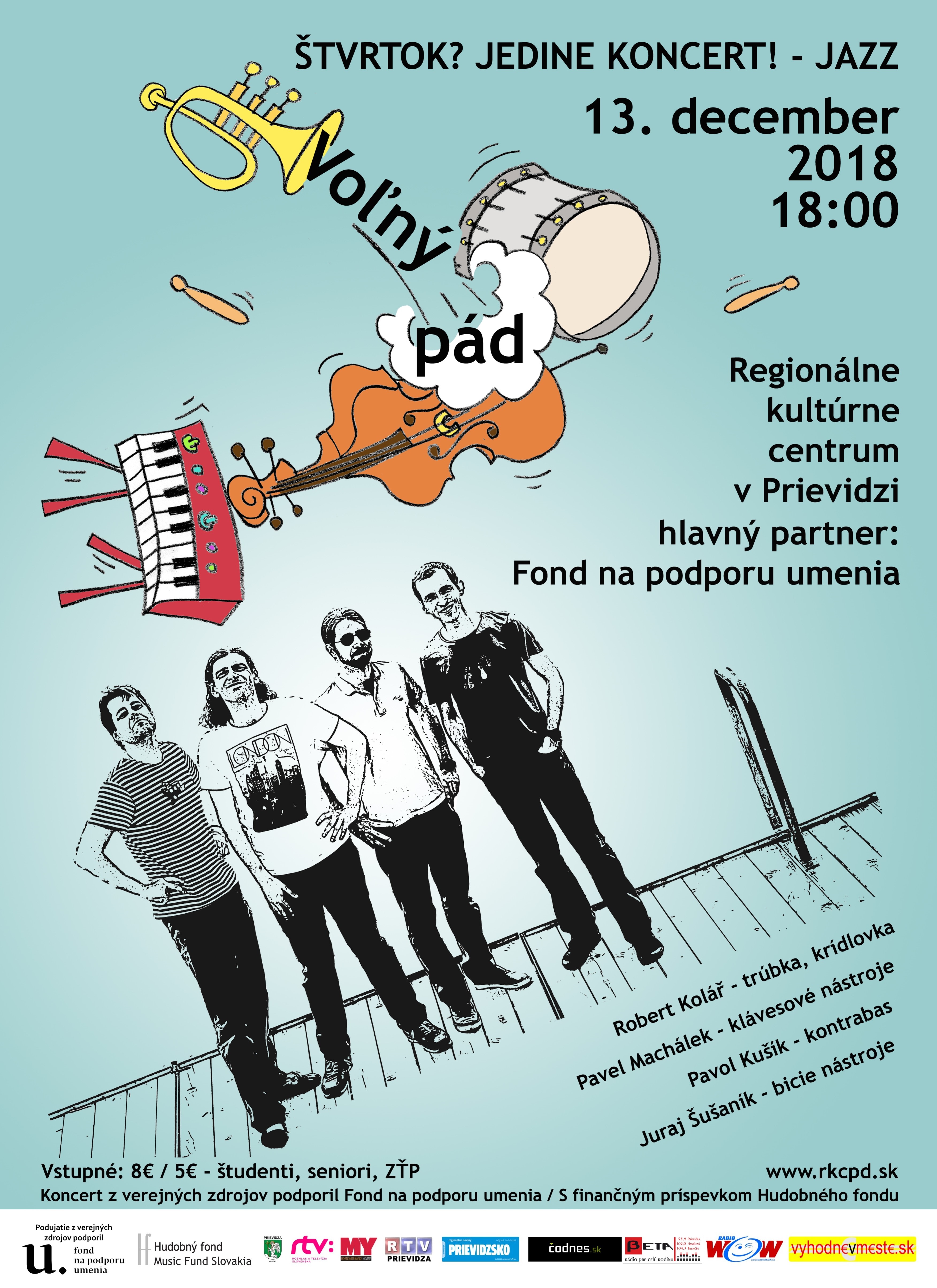 Na koncerte z cyklu Štvrtok? Jedine koncert!, ktorý je zameraný na džez a menšinové žánre dňa 13. decembra vystúpi bratislavská džezová formácia Voľný pád. Koncert sa uskutoční v sále Regionálneho kultúrneho centra v Prievidzi.