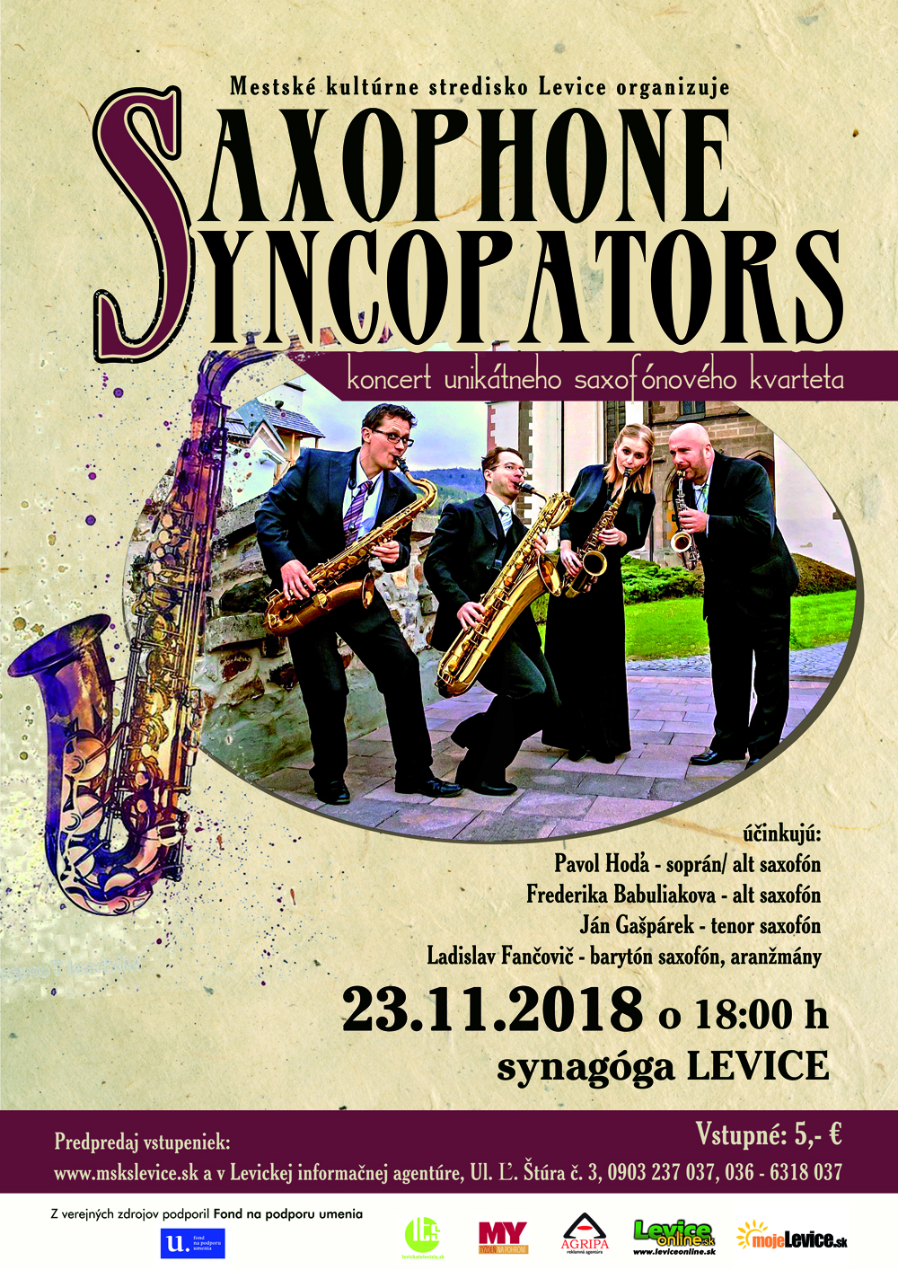 Saxofónové kvarteto Saxophone Syncopators sa zameriava jednak na interpretáciu vážnej hudby, ktorá bola buď priamo skomponovaná pre saxofónové kvarteto v origináli, alebo si známe skladby pre svoje kvarteto upravujú. Koncert je venovaný 100. výročiu vzniku prvej Československej republiky.