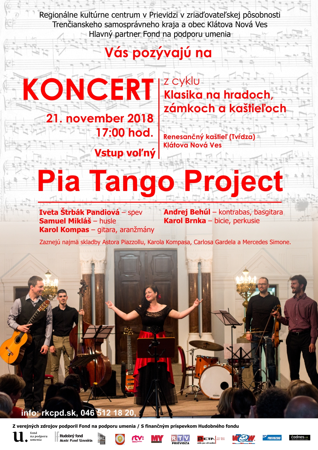 Koncert hudobného zoskupenia PiaTango Project sa uskutoční dňa 21. novembra 2018 o 17:0 hv Renesančnom kaštieli v Klátovej Novej Vsi.