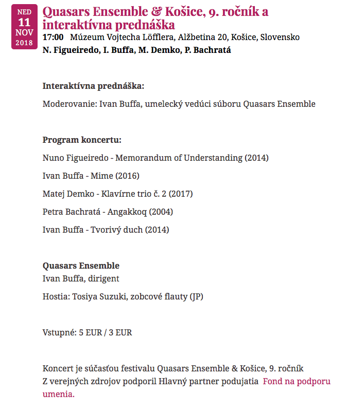 Interaktívna prednáška pred koncertom Quasars Ensemble v Múzeu Vojtecha Löfflera v Košiciach v rámci festivalu Quasars Ensemble & Košice, 9. ročník moderátor: Ivan Buffa, umelecký vedúci Quasars Ensemble Téma: Kontexty v tvorbe slovenských skladateľov