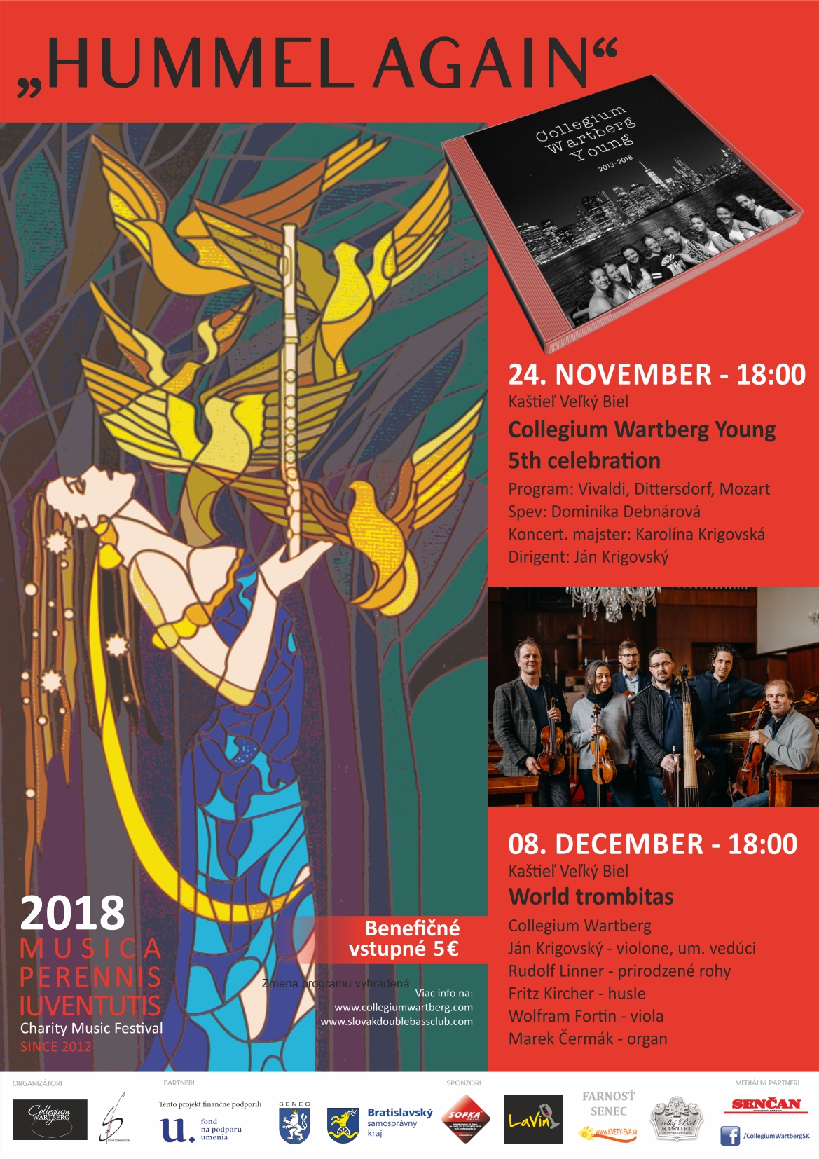 Musica Perennis Iuventutis 2018. Koncerty 24. november 18:00 barokový kaštieľ Veľký Biel - Collegium Wartberg Young /Mozart, Dittersdorf, Vivaldi 8. december 18:00, barokový kaštieľ Veľký Biel - Collegium Wartberg/ Ján Krigovský, Rudolf Linner, Fritz Kircher, Wolfram Fortin, Marek Čermák