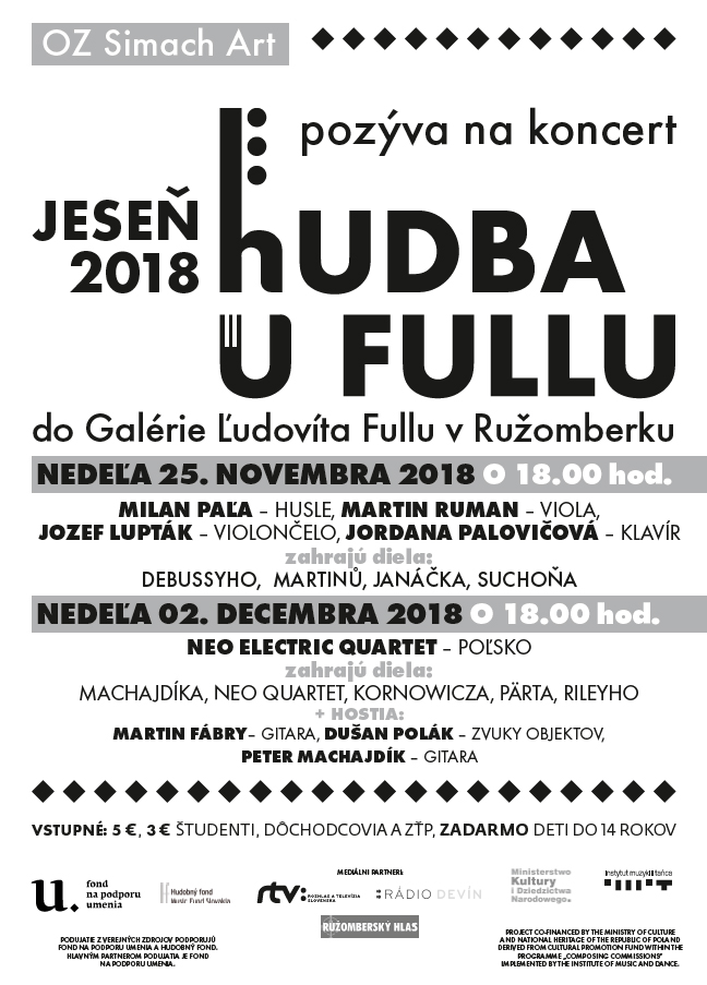 Jordana Palovicova, Jozef Luptak, Milan Paľa, Martin Ruman uvedú diela v rámci projektu Hudba u FUllu 2018 diela Eugena Suchoňa, Leoša Janáčka, Bohuslava Martinů a Claudea Debussyho. Začiatok koncertu je o 18:00 h.