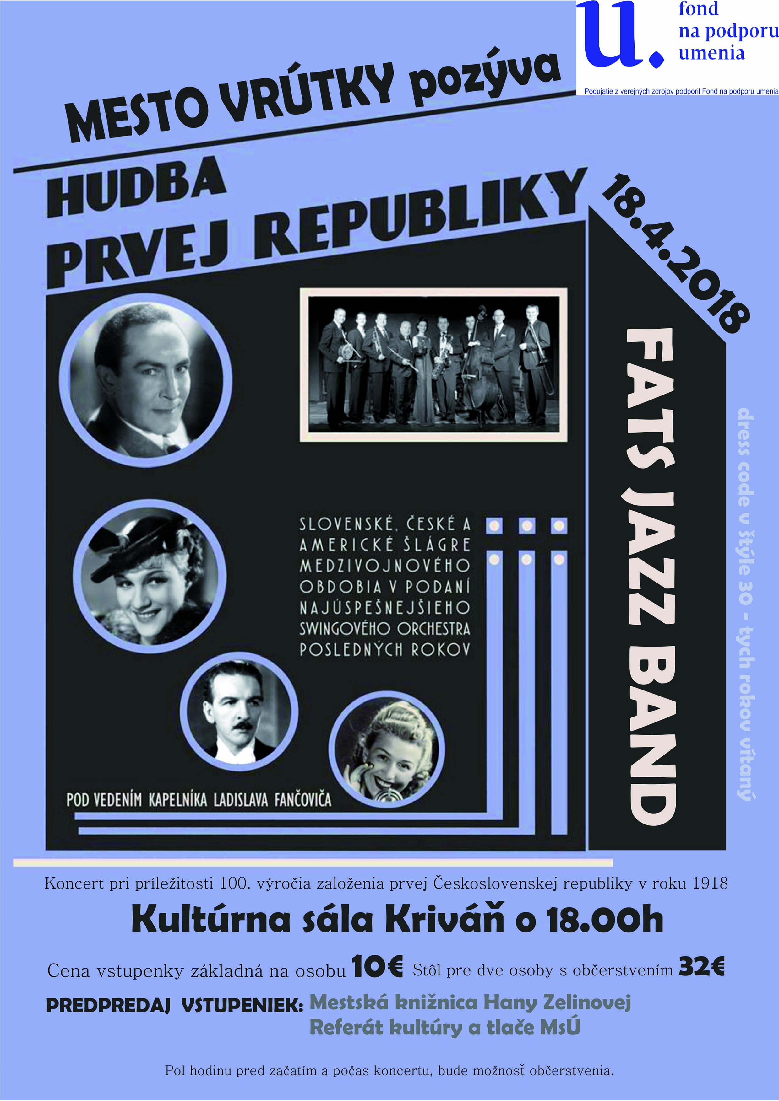 Atmosféru noblesnej doby 20-tych až 40-tych rokov minulého storočia, epochu elegantných gentlemanov a pôvabných dám v róbach vytvorí počas večera 9-členný swingový orchester Fats Jazz Band.
