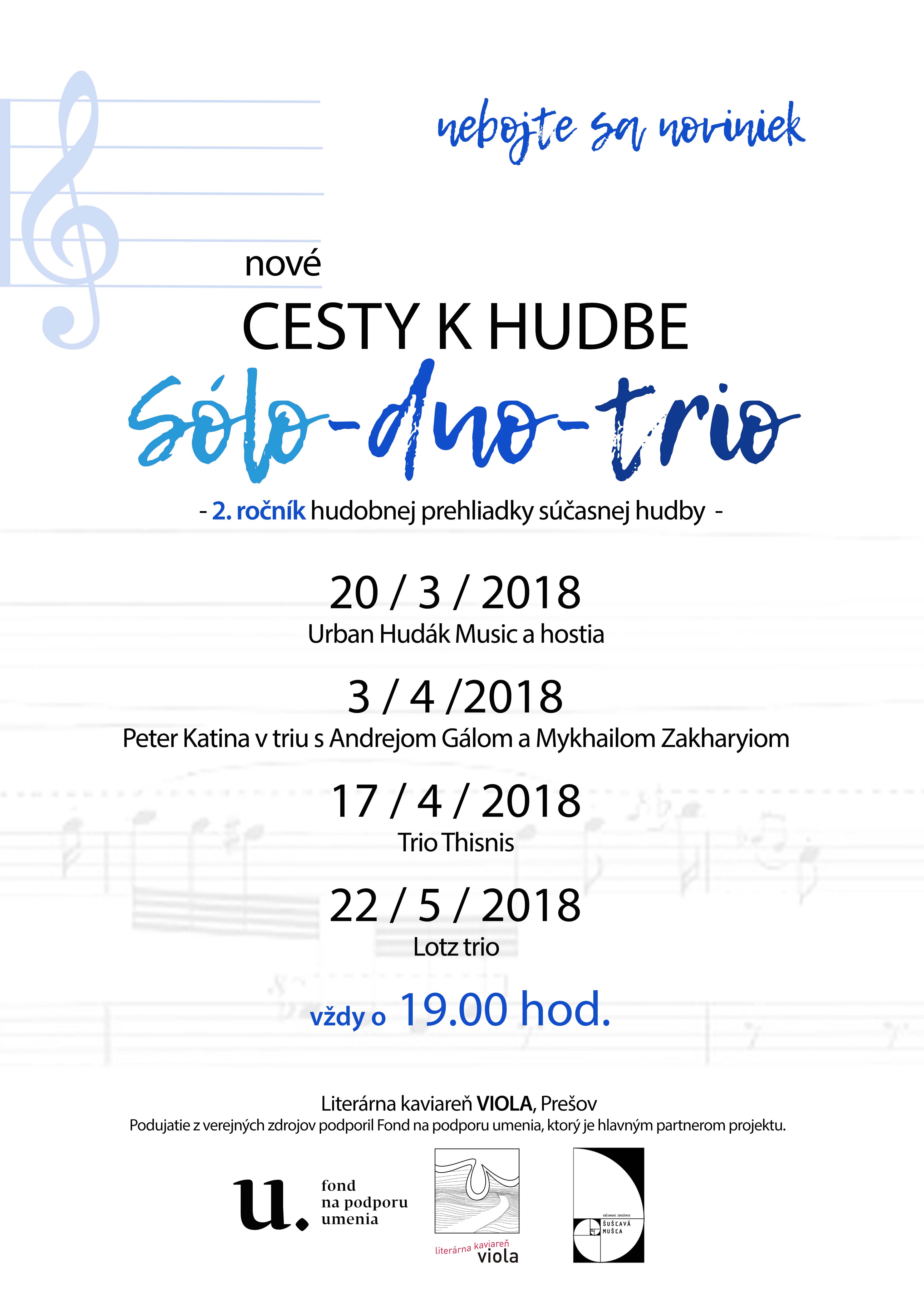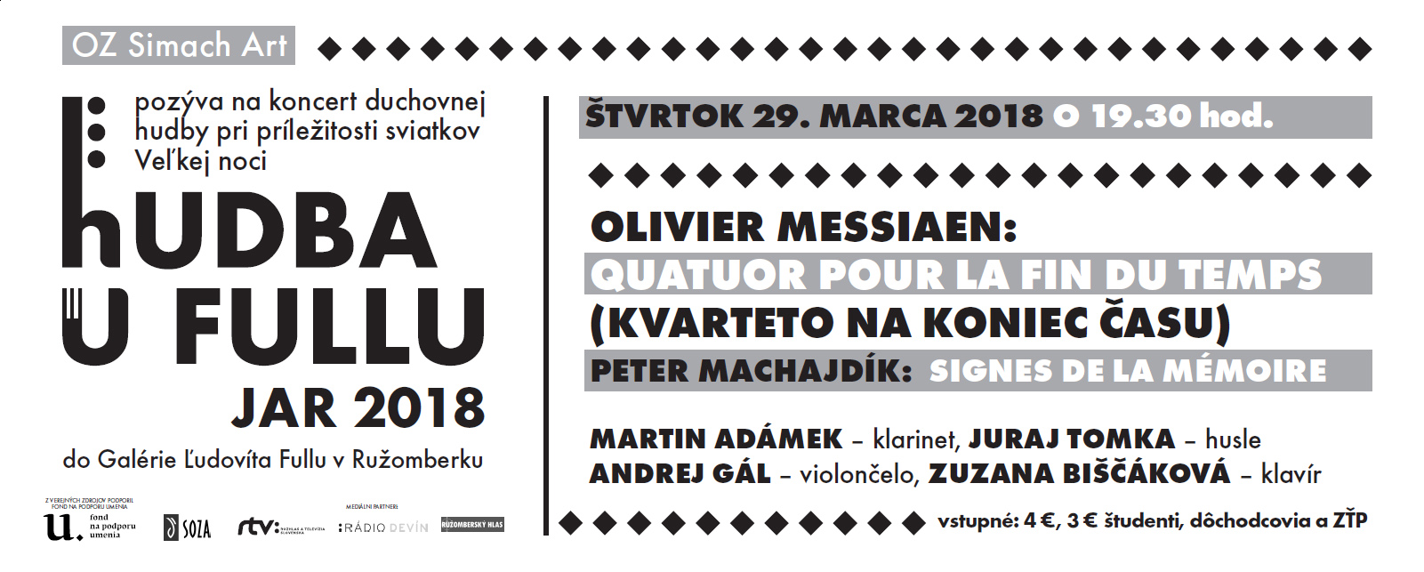 Program: Olivier Messiaen: Quatuor pour la fin du temps (Kvarteto na koniec času) Peter Machajdík: Signes de la mémoire Účinkujú: Martin Adámek - klarinet, Juraj Tomka - husle, Andrej Gál - violončelo, Zuzana Biščáková - klavír Štvrtok 29.3.2018 o 19:30 h v Galérii Ľudovíta Fullu, Ružomberok