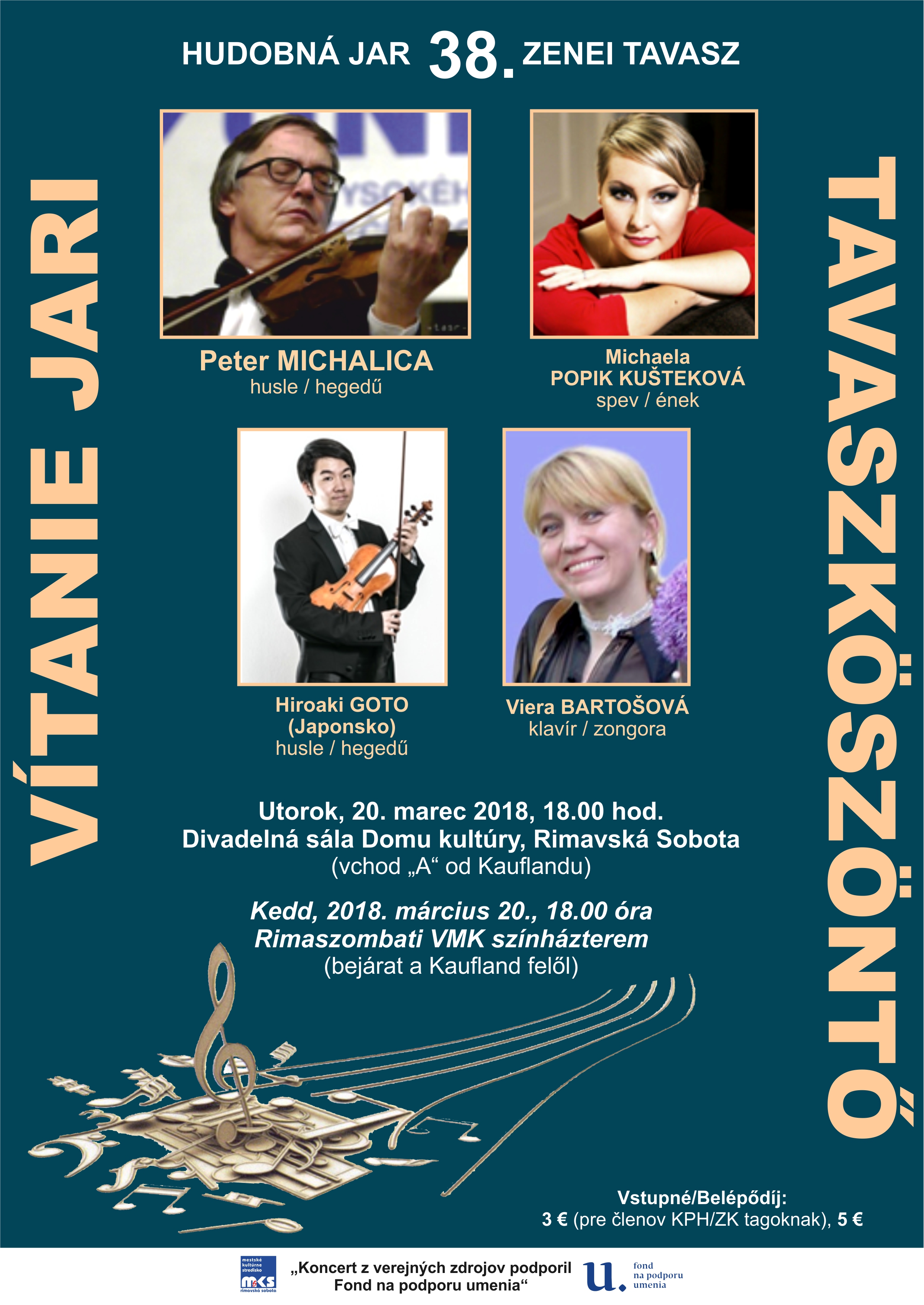38. ročník Hudobnej jari v Rimavskej Sobote otvoríme 20. marca 2018 o 18.00 hod. v divadelnej sále DK koncertom vynikajúceho slovenského husľového virtuóza Petra Michalicu, jeho žiaka Hiroaki Gota z Japonska a sopranistky Michaely Popik Kuštekovej. Klavírny sprievod: Viera Bartošová. V programe sú zaradené skladby známych hudobných velikánov: A. Vivaldiho, S. Rachmaninova, I. Zeljenku, A. Dvořáka, J. Brahmsa, J. S. Bacha, W. A. Mozarta.