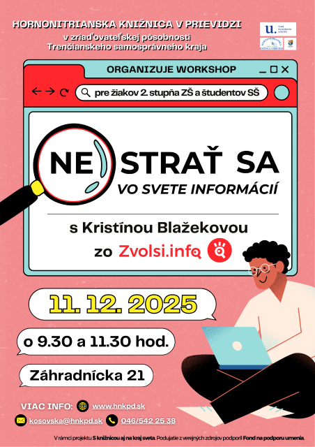 Pochopiť informácie, naučiť sa ich a kriticky zhodnotiť je čoraz dôležitejšie. Preto sme oslovili lektorov z občianskeho združenia Zvol si info, aby v našej knižnici zrealizovali workshopy pre žiakov a študentov. Tešíme sa, že našu knižnicu navštívi Mgr. Kristína Blažeková PhD., aby naučila žiakov a študentov, ako kriticky rozmýšľať a orientovať sa v mediálnom svete