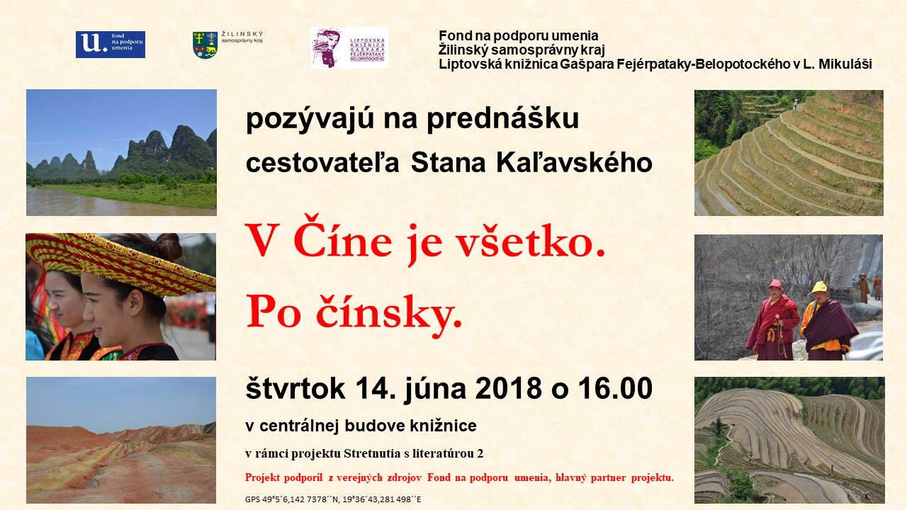 Beseda s cestovateľom Stanom Kaľavským o jeho ceste po Číne.