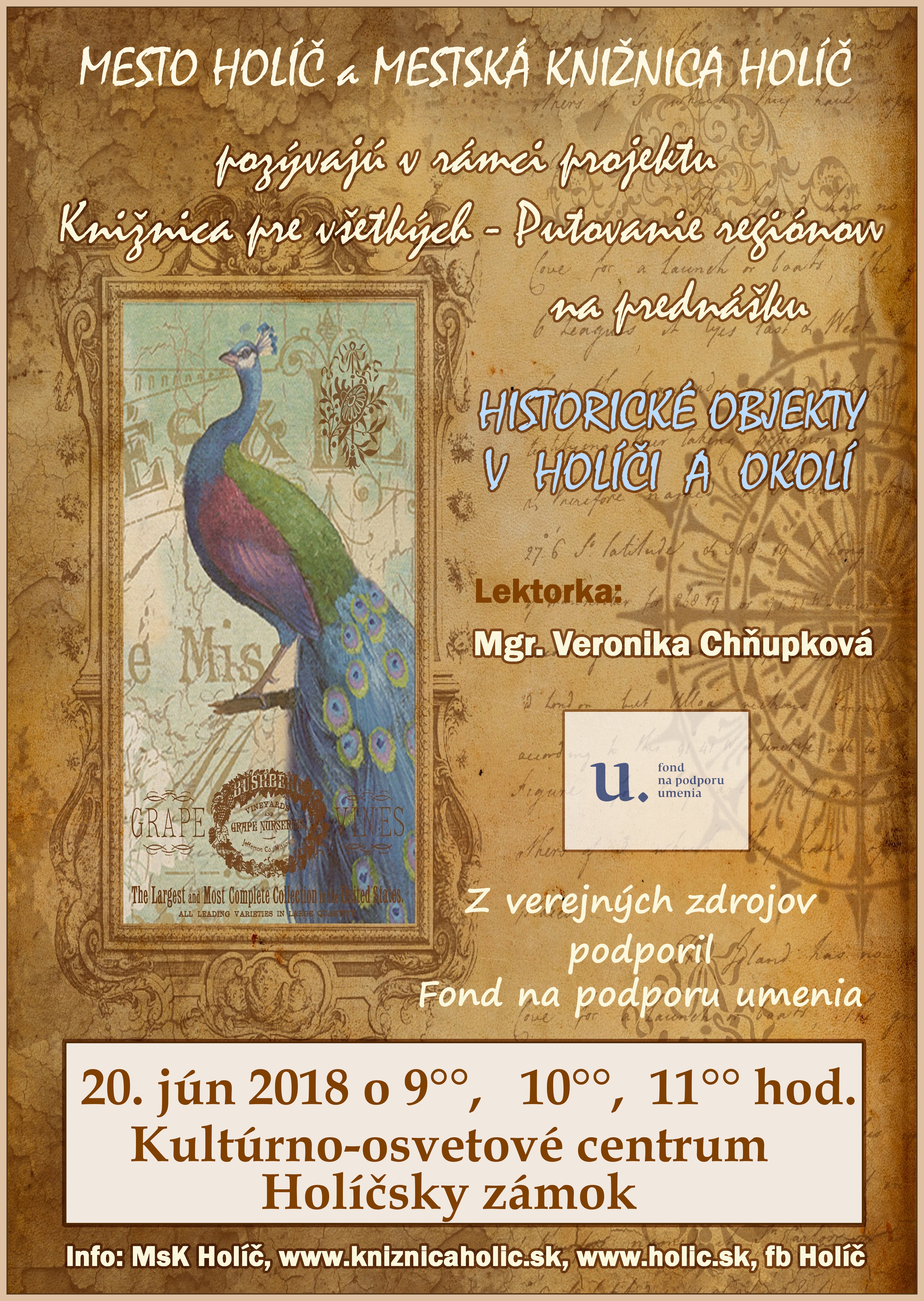 Mesto Holíč a Mestská knižnica Holíč Vás pozýva na prednášku Historické objekty v Holíči a okolí, ktorá sa uskutoční dňa 20.6.2018 o 9.00, 10.00 a 11.00 hod. v priestoroch Kultúrno-osvetového centra, nachádzajúceho sa v areáli Holíčskeho zámku.