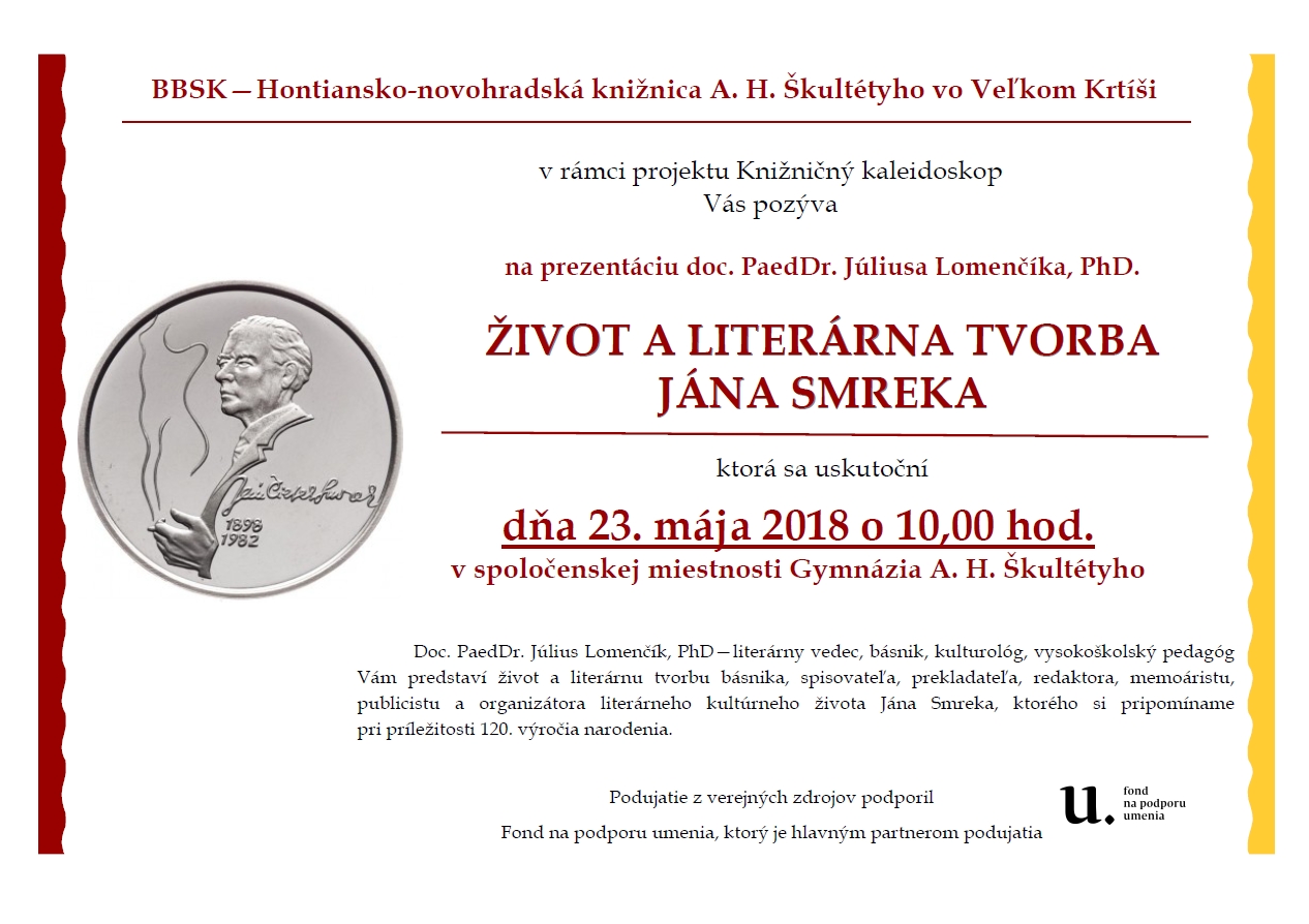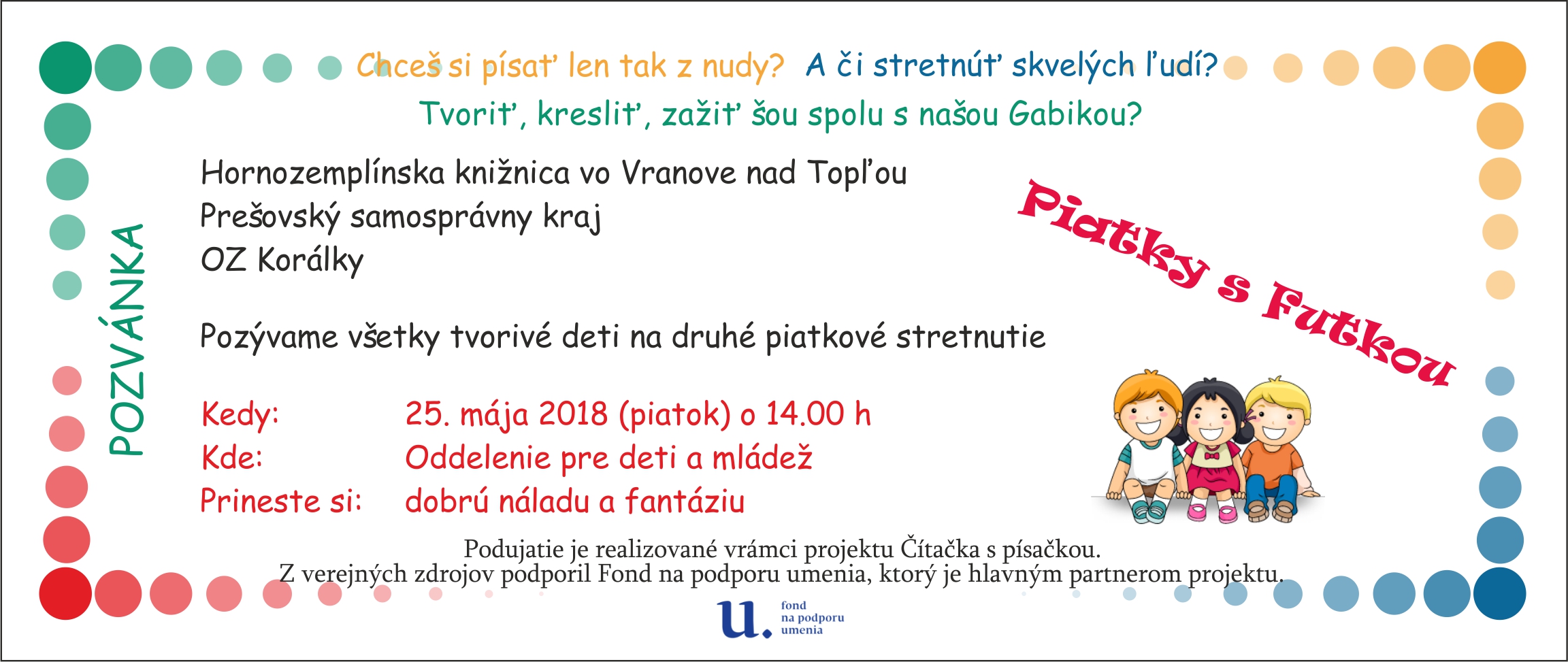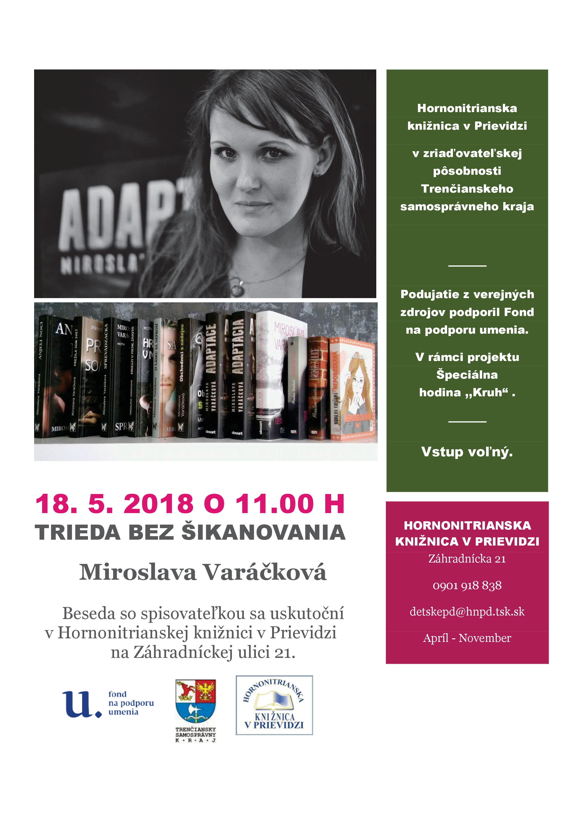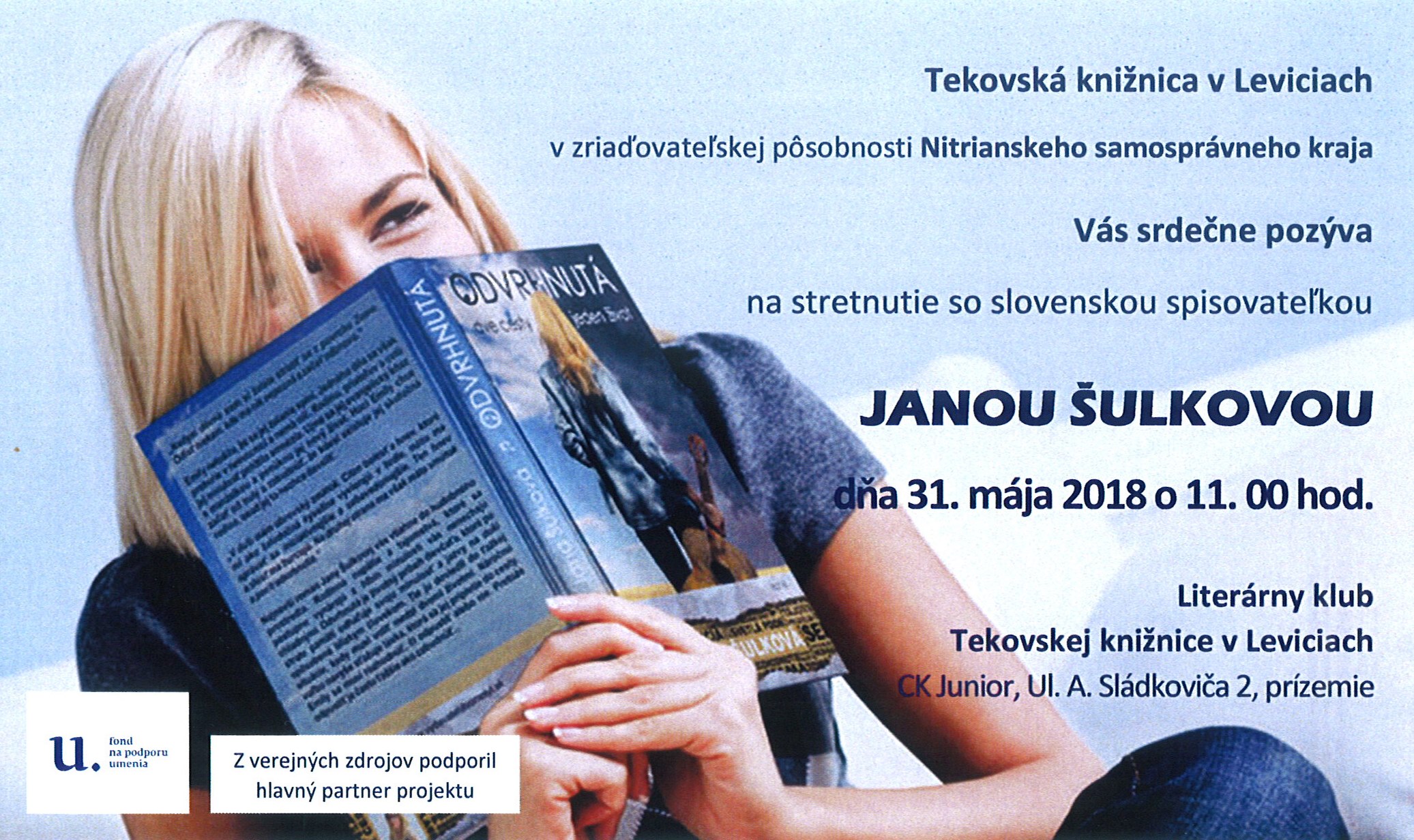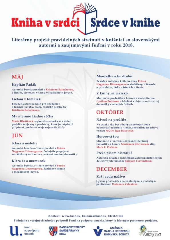 Literárny projekt pravidelných stretnutí so slovenskými autorkami a autormi, ktorí sa venujú tvorbe pre deti a mládež i dospelých. Cieľom projektu je podpora čítania, výchova k literárnemu a ilustračnému umeniu, formovanie pozitívneho vzťahu čitateľov k rodnému jazyku, rozširovanie vedomostí žiakov a obohatenie učiva, popularizácia prírodných vied a kritické myslenie. Podujatie z verejných zdrojov podporil Fond na podporu umenia, ktorý je hlavným partnerom projektu.