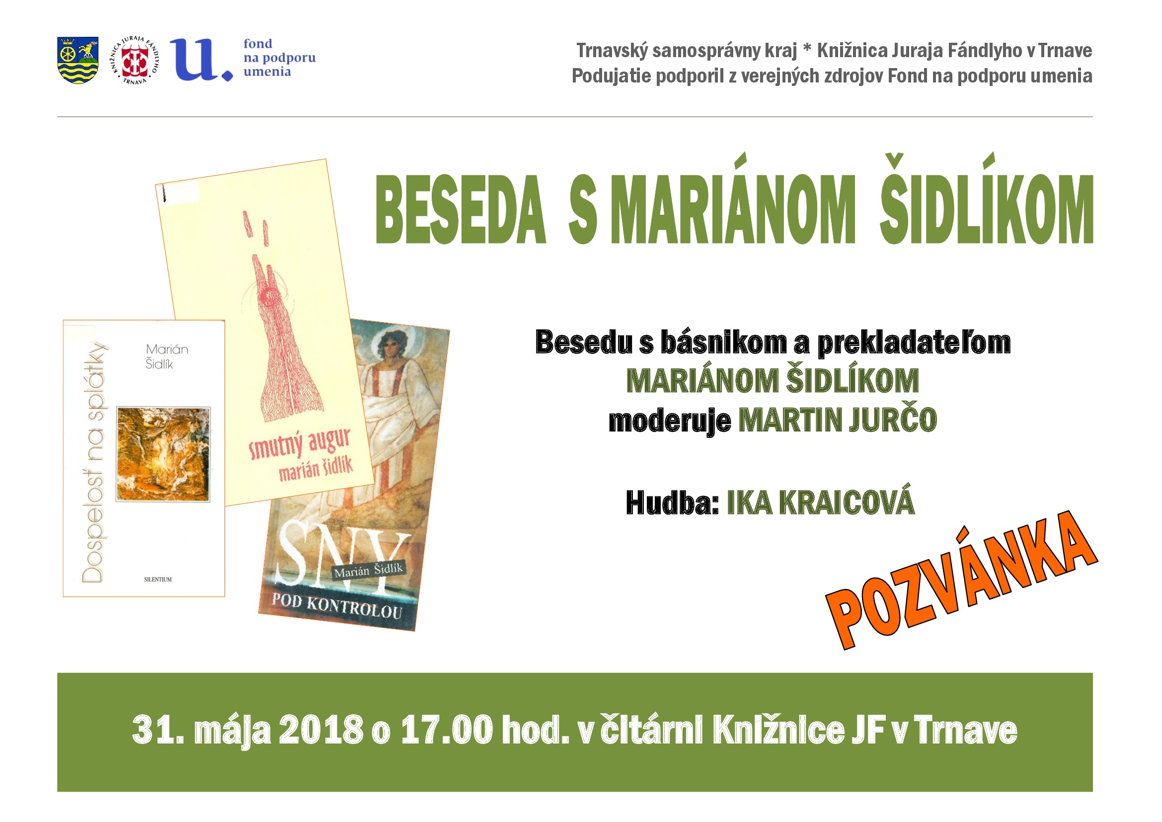 Knižnica Juraja Fándlyho v Trnave pripravuje pre širokú verejnosť besedu s Mariánom Šidlíkom - dlhoročným hlásateľom Slovenského rozhlasu, básnikom, prekladateľom a publicistom. Prekladá poéziu z angličtiny, píše kratšie prozaické útvary a intenzívne sa zaoberá etymológiou. Poslednou zbierkou básní je knižka s názvom Len tu žiť, ktorá vyšla v roku 2017.