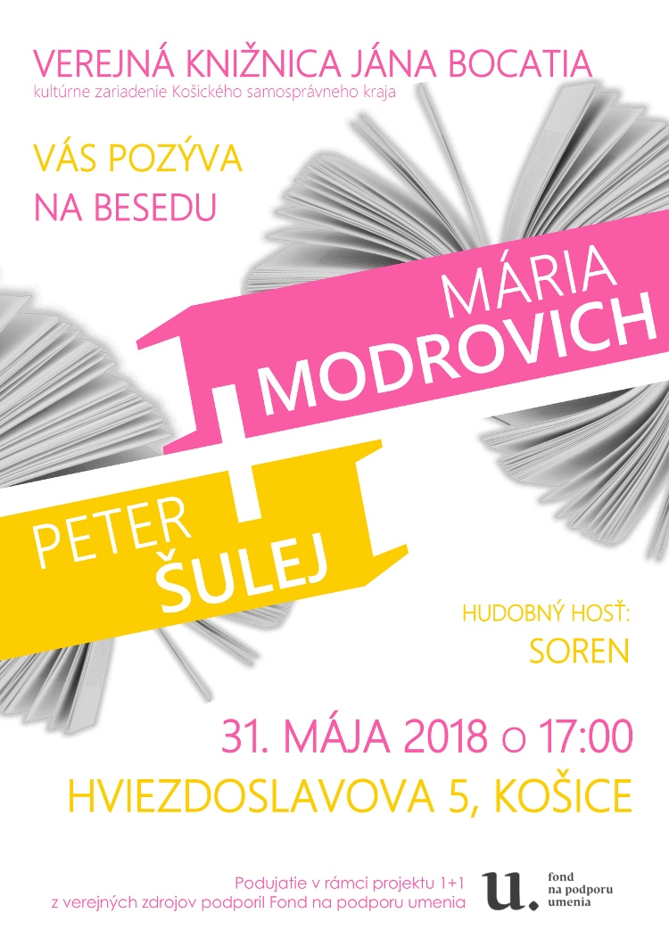 Posledné predprázdninové podujatie z cyklu besied so známymi slovenskými spisovateľmi a ich hosťami 1+1 zorganizuje Verejná knižnica Jána Bocatia v Košiciach (VKJB) vo štvrtok 31. mája 2018 o 17:00 v centrálnej požičovni na Hviezdoslavovej ul. 5. O literárnej tvorbe, vydavateľskej činnosti sa budeme rozprávať s prozaičkou a publicistkou Máriou Modrovich a básnikom, prozaikom a vydavateľom Petrom Šulejom. Hudobným hosťom večera bude hudobná skupina Soren.