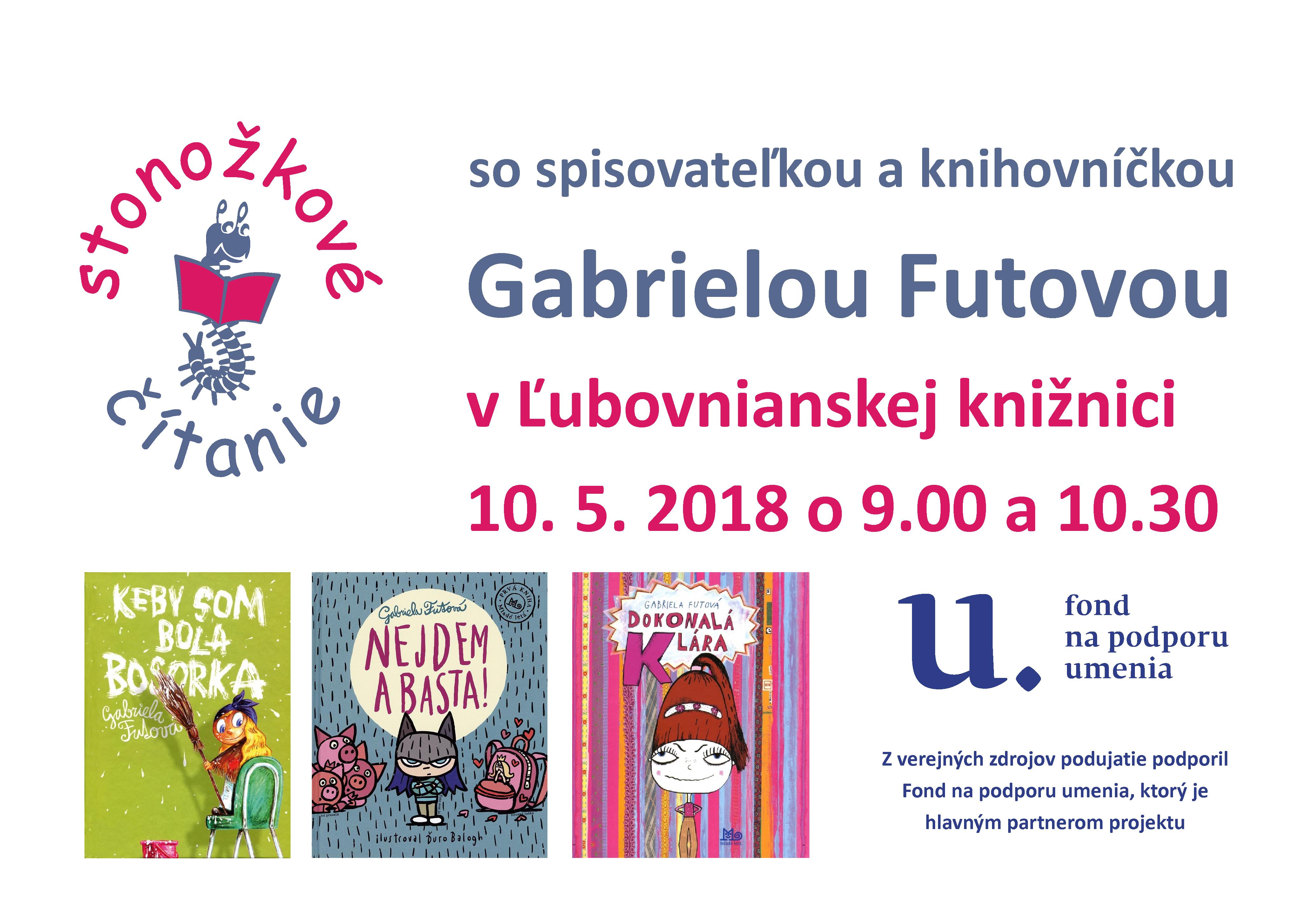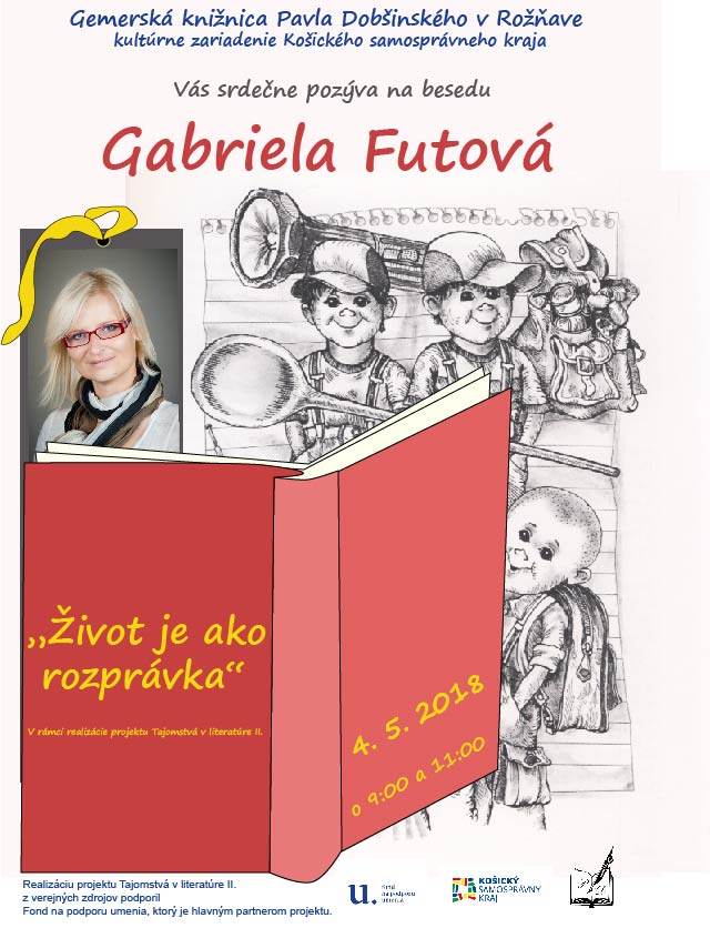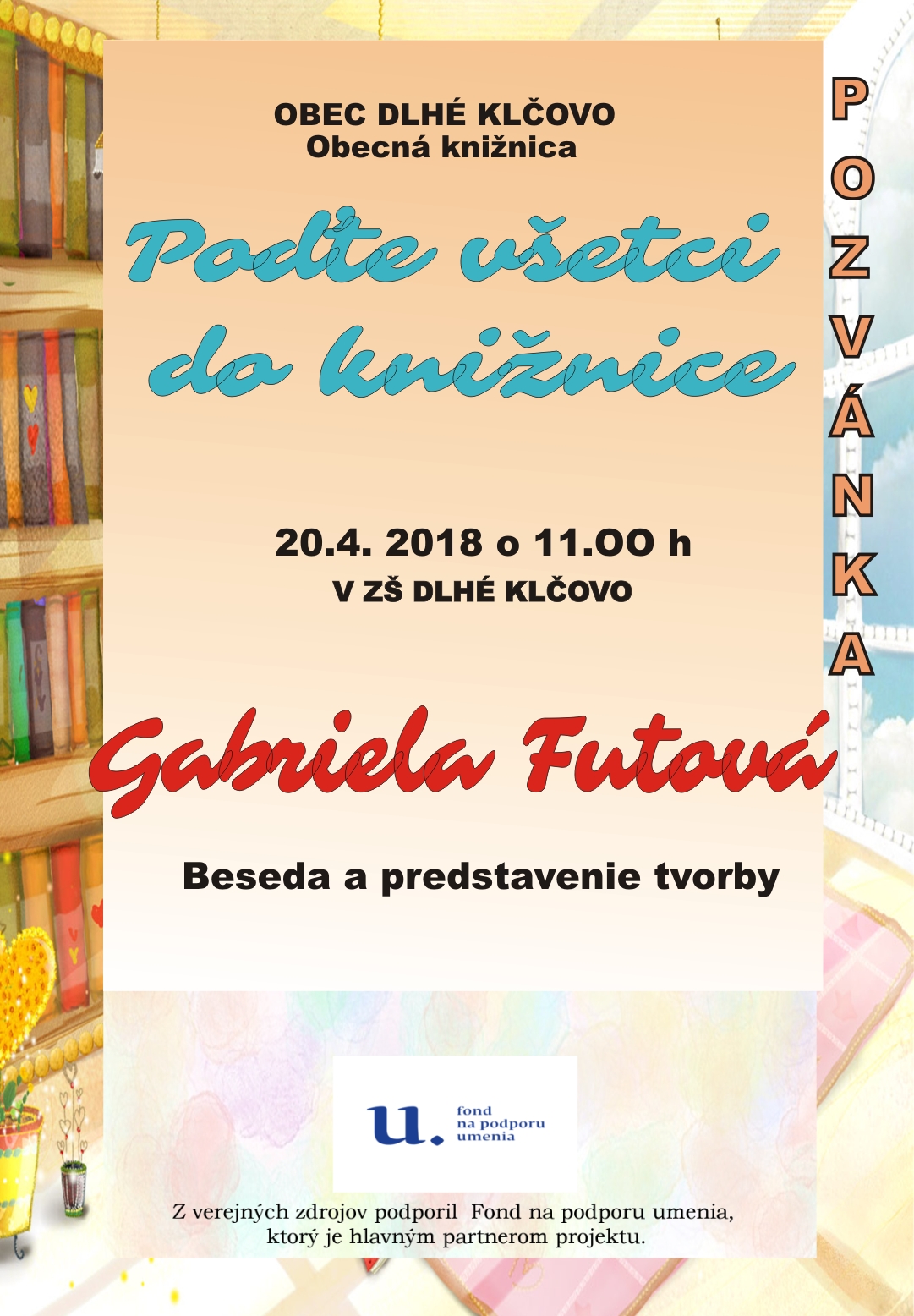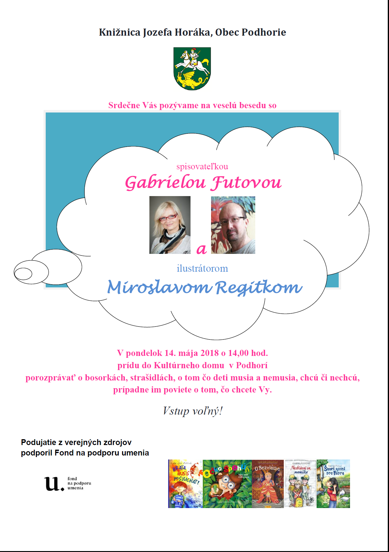 Knižnica Jozefa Horáka, Obec Podhorie Vás srdečne pozýva na veselú besedu so spisovateľkou detskej literatúry Gabrielou Futovou a ilustrátorom Miroslavom Regitkom, ktorá sa bude konať dňa 14. mája 2018, t.j. pondelok o 14,00 hod. v Kultúrnom dome v Podhorí , kde prídu porozprávať o bosorkách, strašidlách, o tom čo deti musia a nemusia, chcú či nechcú, prípadne im deti povedia o tom, čo chcú oni. Vstup je voľný. Podujatie z verejných zdrojov podporil Fond na podporu umenia.