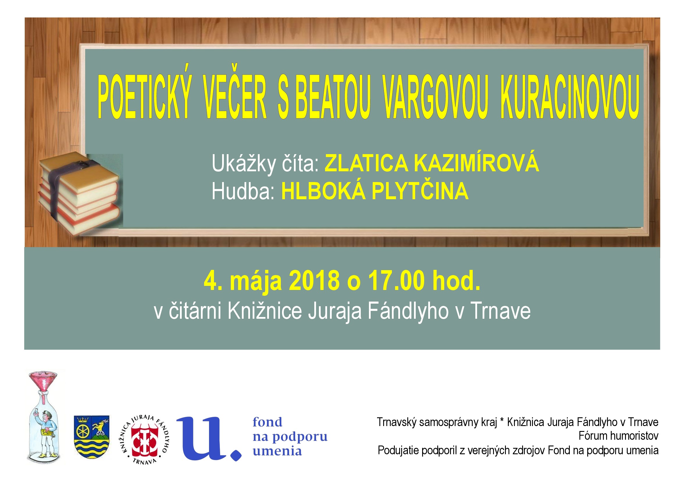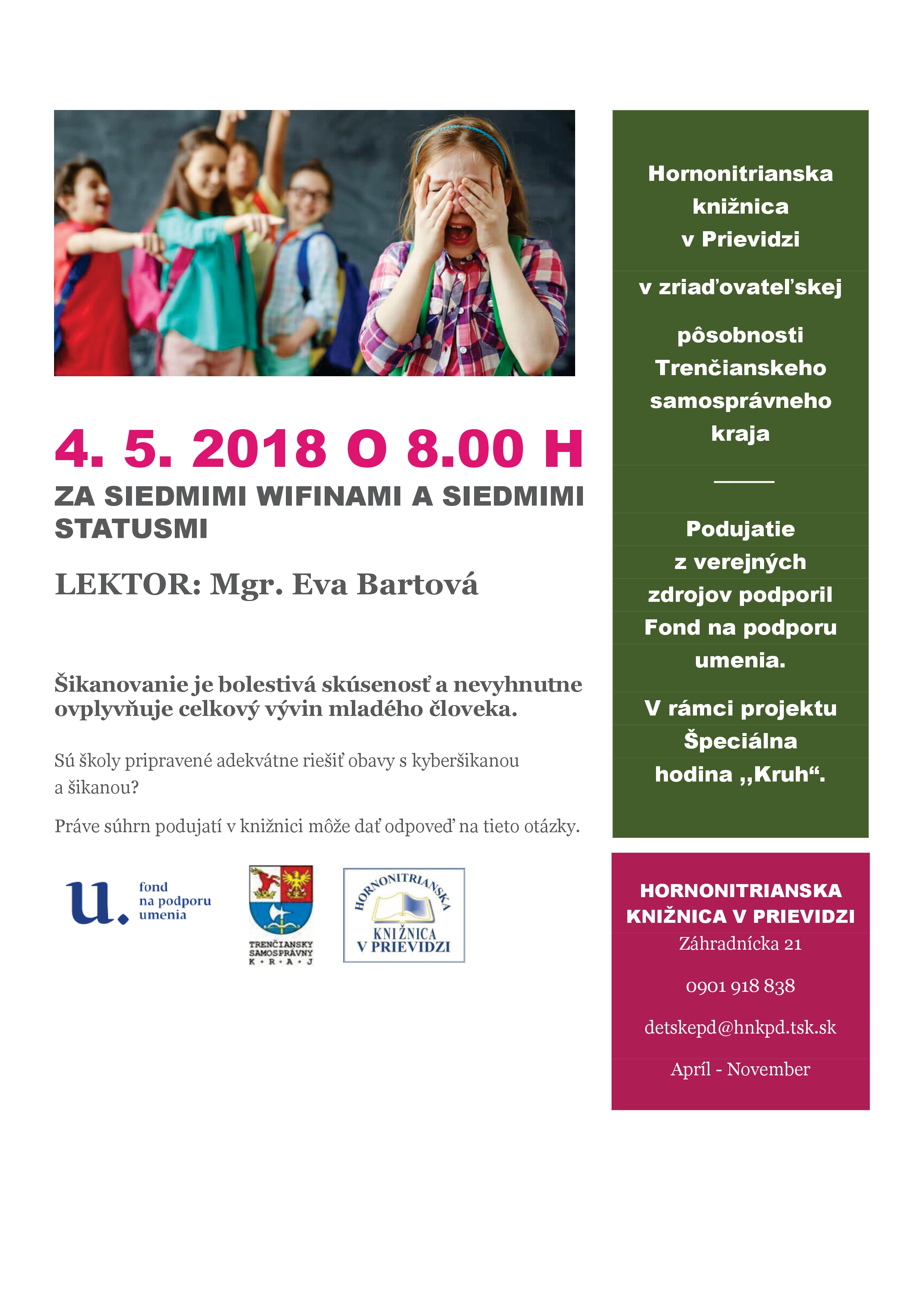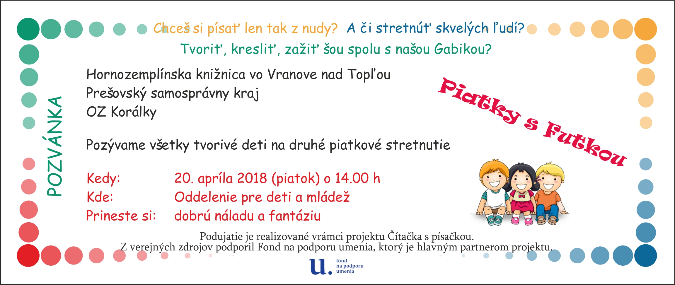 Knižnica Jozefa Horáka, Obec Podhorie Vás srdečne pozýva na veselú besedu so spisovateľkou detskej literatúry Gabrielou Futovou a ilustrátorom Miroslavom Regitkom, ktorá sa bude konať dňa 14. mája 2018, t.j. pondelok o 14,00 hod. v Kultúrnom dome v Podhorí , kde prídu porozprávať o bosorkách, strašidlách, o tom čo deti musia a nemusia, chcú či nechcú, prípadne im deti povedia o tom, čo chcú oni. Vstup je voľný. Podujatie z verejných zdrojov podporil Fond na podporu umenia.