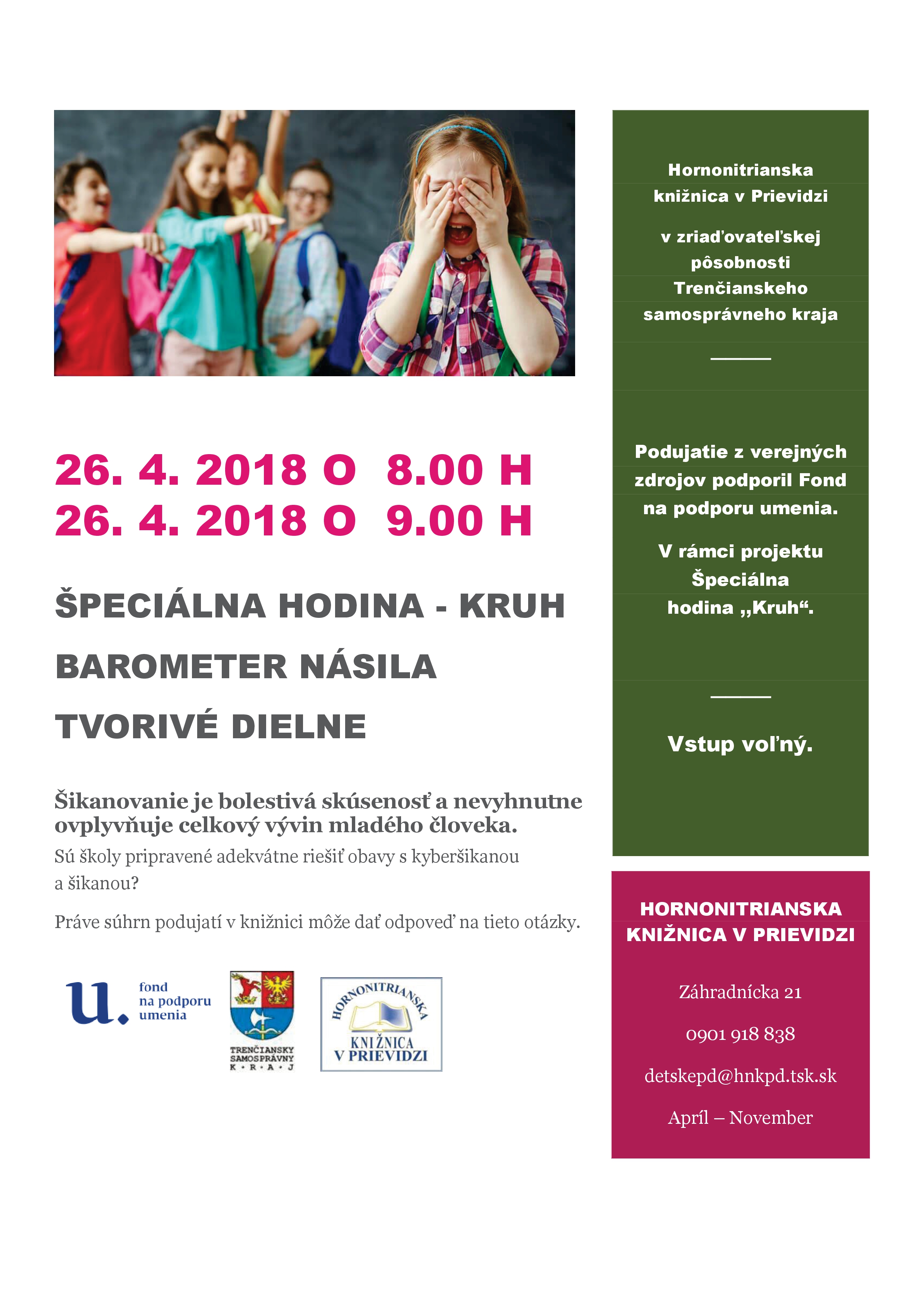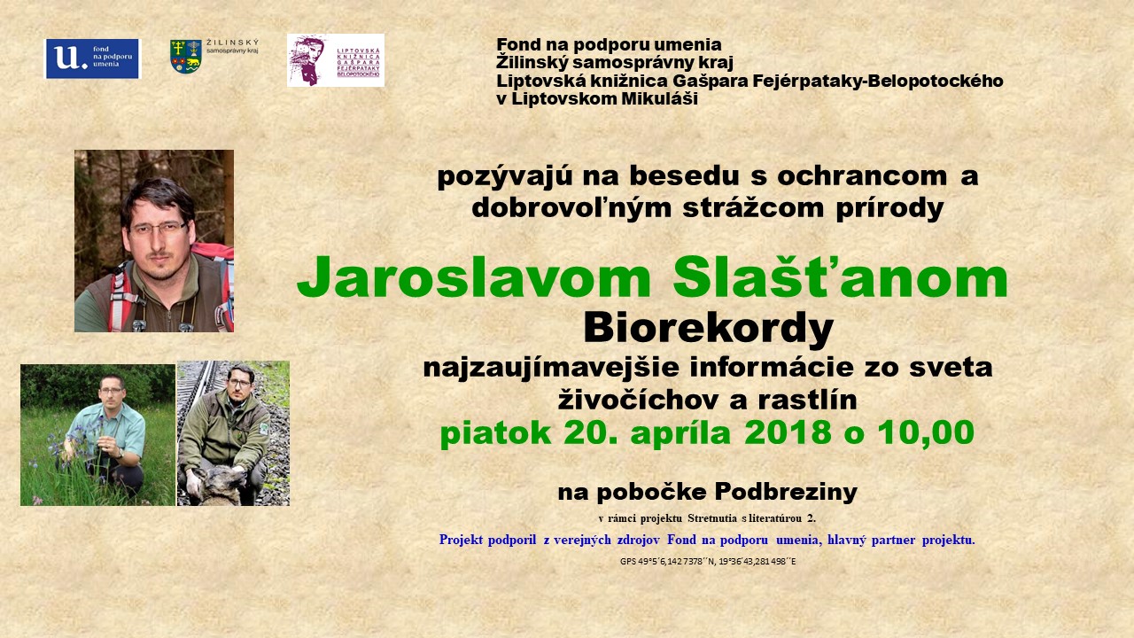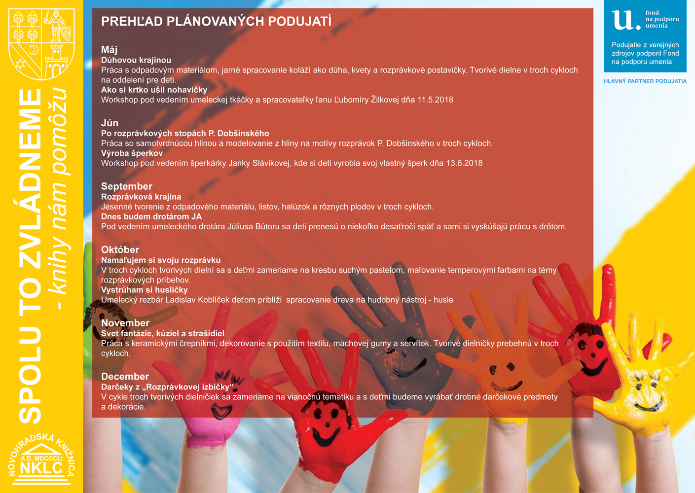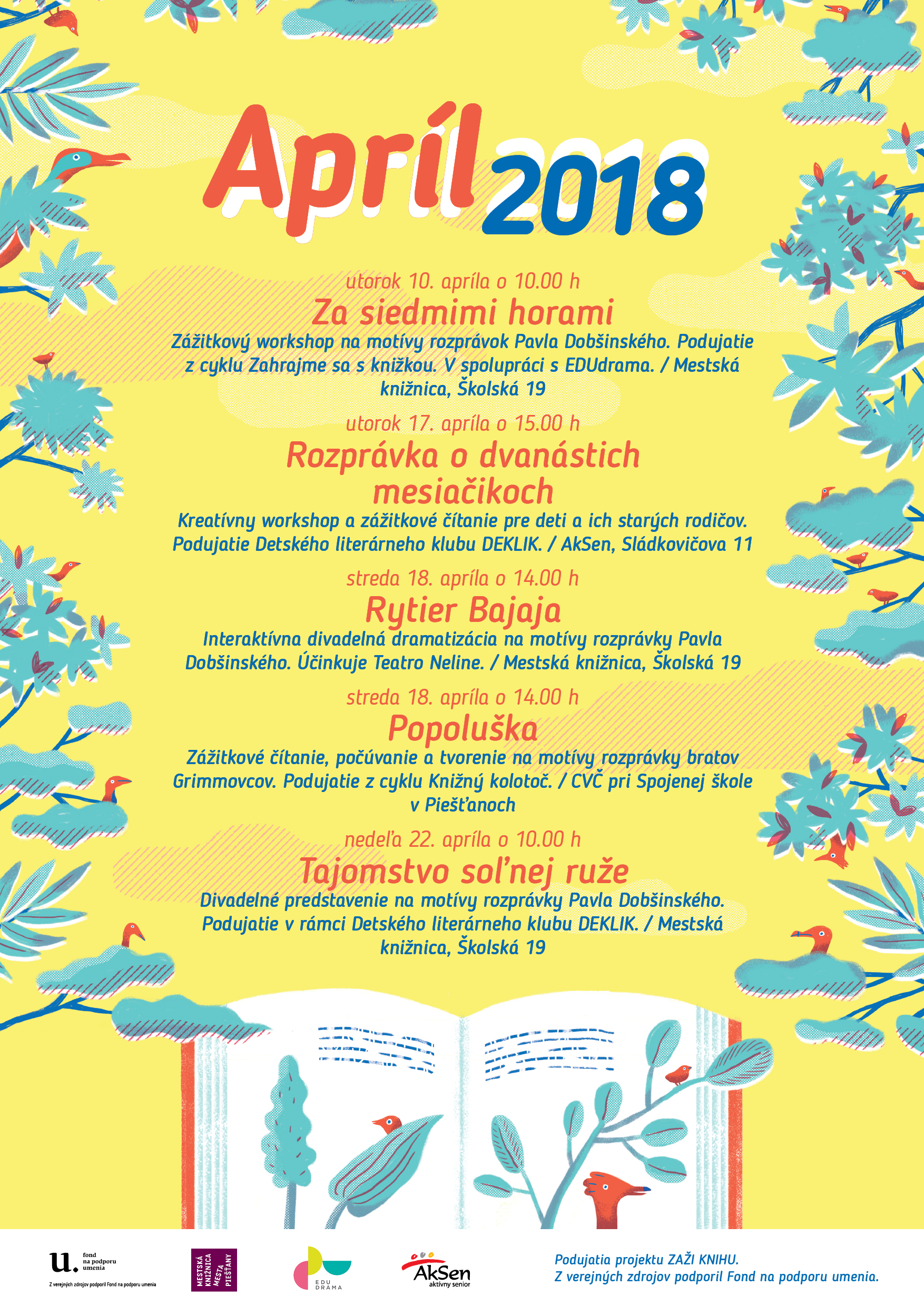 Jedná sa o cyklus stretnutí s autormi súčasnej literárnej tvorby pre deti, besedou o spisovateľovi P. Dobšinskom chceme deťom pripomenúť 190.výročie jeho narodenia. Významné výročie ukončenia 1.svetovej vojny a vzniku Prvej československej republiky chceme priblížiť študentom prednáškou historika, politológa. Plánujeme osloviť známe osobnosti regiónu pre spoločné čítanie multikultúrnych rozprávok. Cyklus uzavrieme výstavou výtvarných prác detí a žiakov spojenej s dramatizovaným čítaním príbehov.