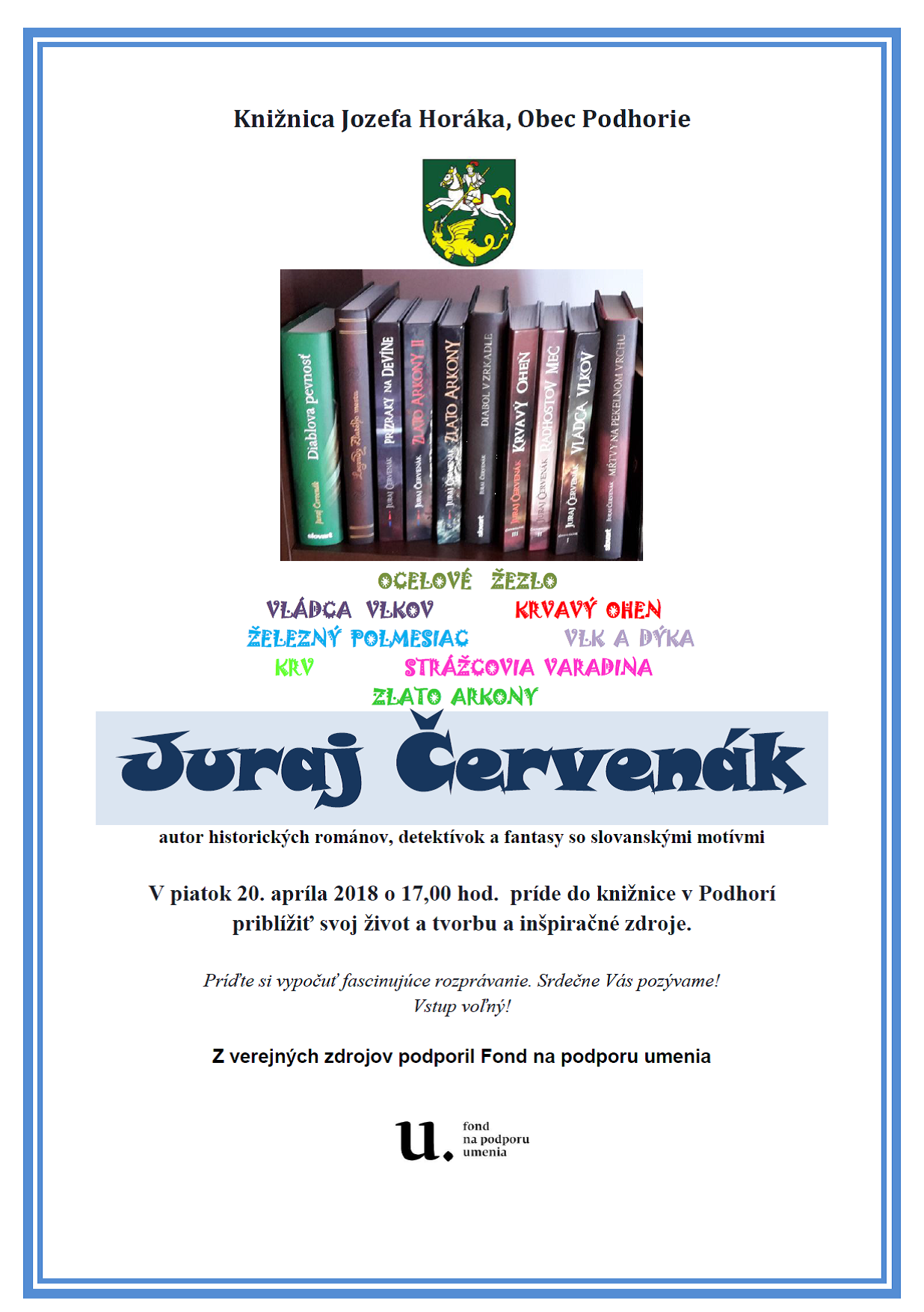 Beseda so známym spisovateľom Jurajom Červenákom pochádzajúcim z Vyhní, ktorý vo svojich námetoch vychádzal z mesta Banská Štiavnica a jeho okolia. Beseda sa bude konať dňa 20. apríla 2018 o 17,00 hod v priestoroch čitárne Knižnice Jozefa Horáka. Autor príde do knižnice v Podhorí priblížiť svoj život a tvorbu a inšpiračné zdroje. Cieľovou skupinou podujatia je staršia mládež a dospelí vo veku od 15 rokov.