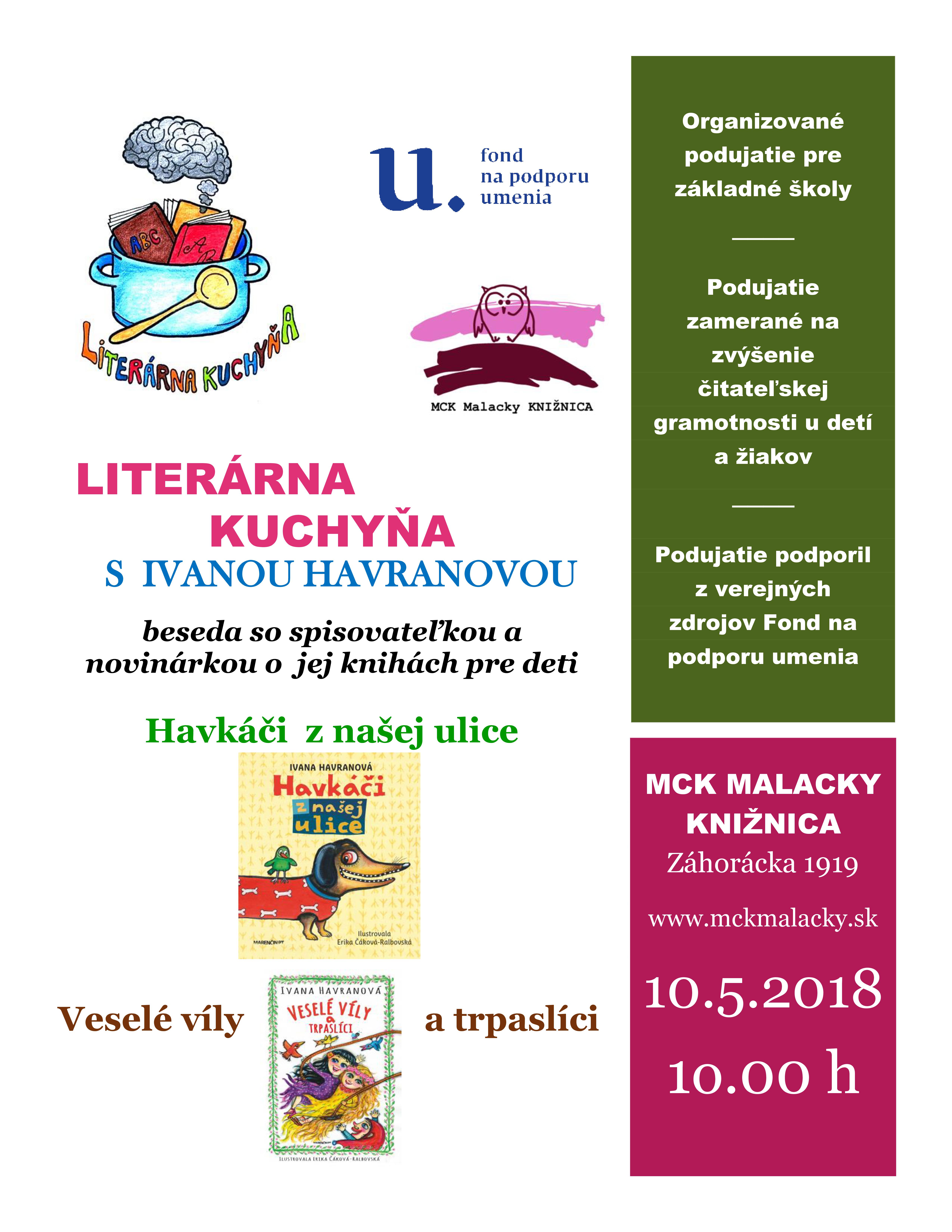 Knižnica MCK Malacky v Literárnej kuchyni namiešala tretiu jarnú výchovno-vzdelávaciu kašu, ktorá podporuje čitateľskú gramotnosť, čiže trávenie kníh u detí a mládeže a ich záujem o literatúru. Pripravili sme pre žiakov 1. a 2. ročníka základnej školy stretnutie so spisovateľkou a novinárkou o jej knihách pre deti: Havkáči z našej ulice a Veselé víly a trpaslíci.
